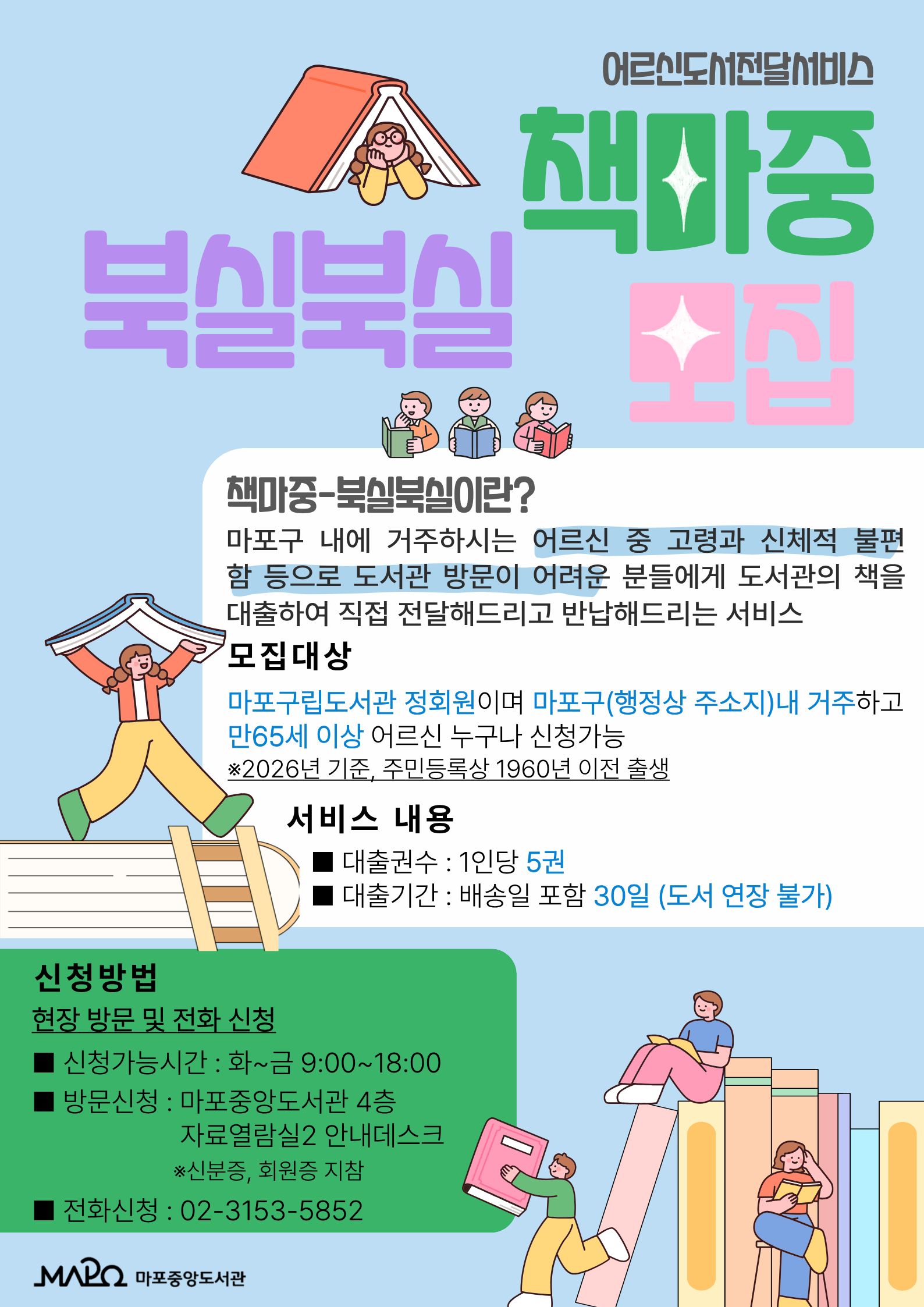 마포구에 거주하시며, 고령과 신체적 불편함 등으로 도서관 방문이 어려운 만65세 이상 시니어 이용자 (※2026년 기준, 주민등록상 1960년 이전 출생)
