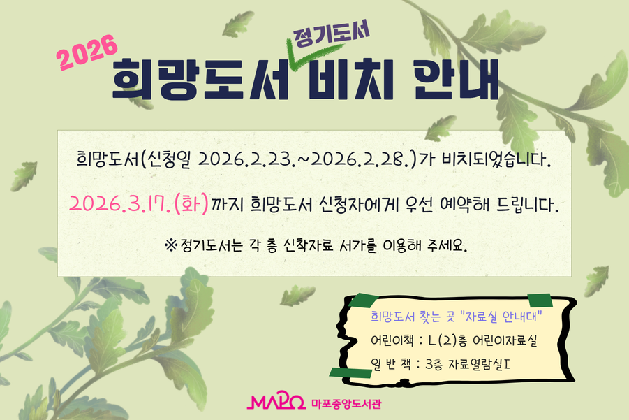 희망도서(신청일 2026.2.23.~2026.2.28.)가 비치되었습니다. 2026.3.17.(화)까지희망도서 신청자에게 우선 예약해 드립니다.
