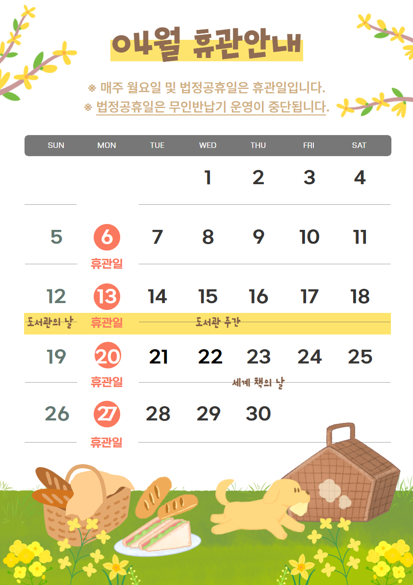 마포중앙도서관 2026년 4월 휴관일은 6일(월), 13일(월), 20일(월), 27일(월)입니다.