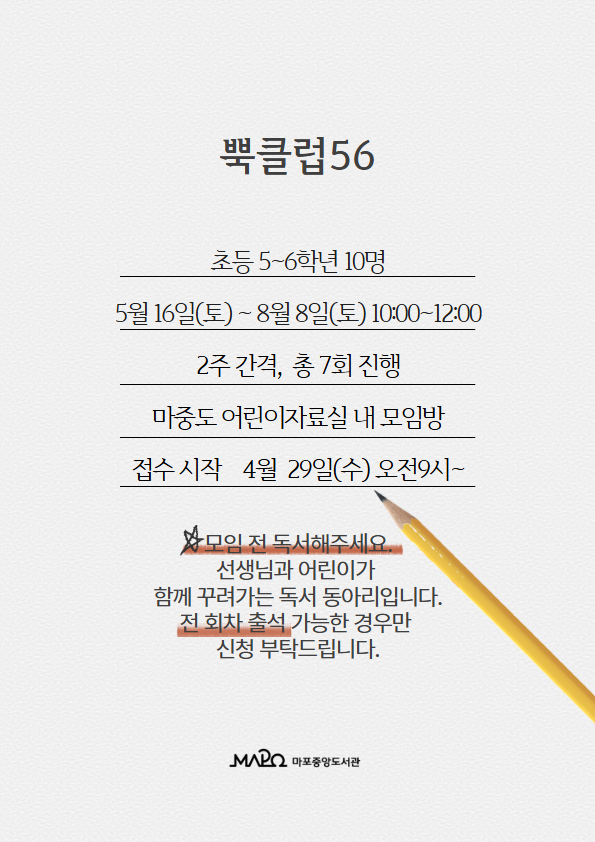 뿍클럽56 대상 : 초등 5~6학년 10명 기간 : 5월 16일(토) ~ 8월 8일(토) 13:00~15:00 2주 간격, 총 7회 진행 장소 : 마중도 어린이자료실 내 모임방 강사 : 오기희(독서지도사) 접수 : 4월 29일(수) 9:00~ (도서관 홈페이지) *모임 전 독서해주세요. *차시별 도서를 지참해 주세요. *2회 이상 결석 시 탈퇴됩니다.