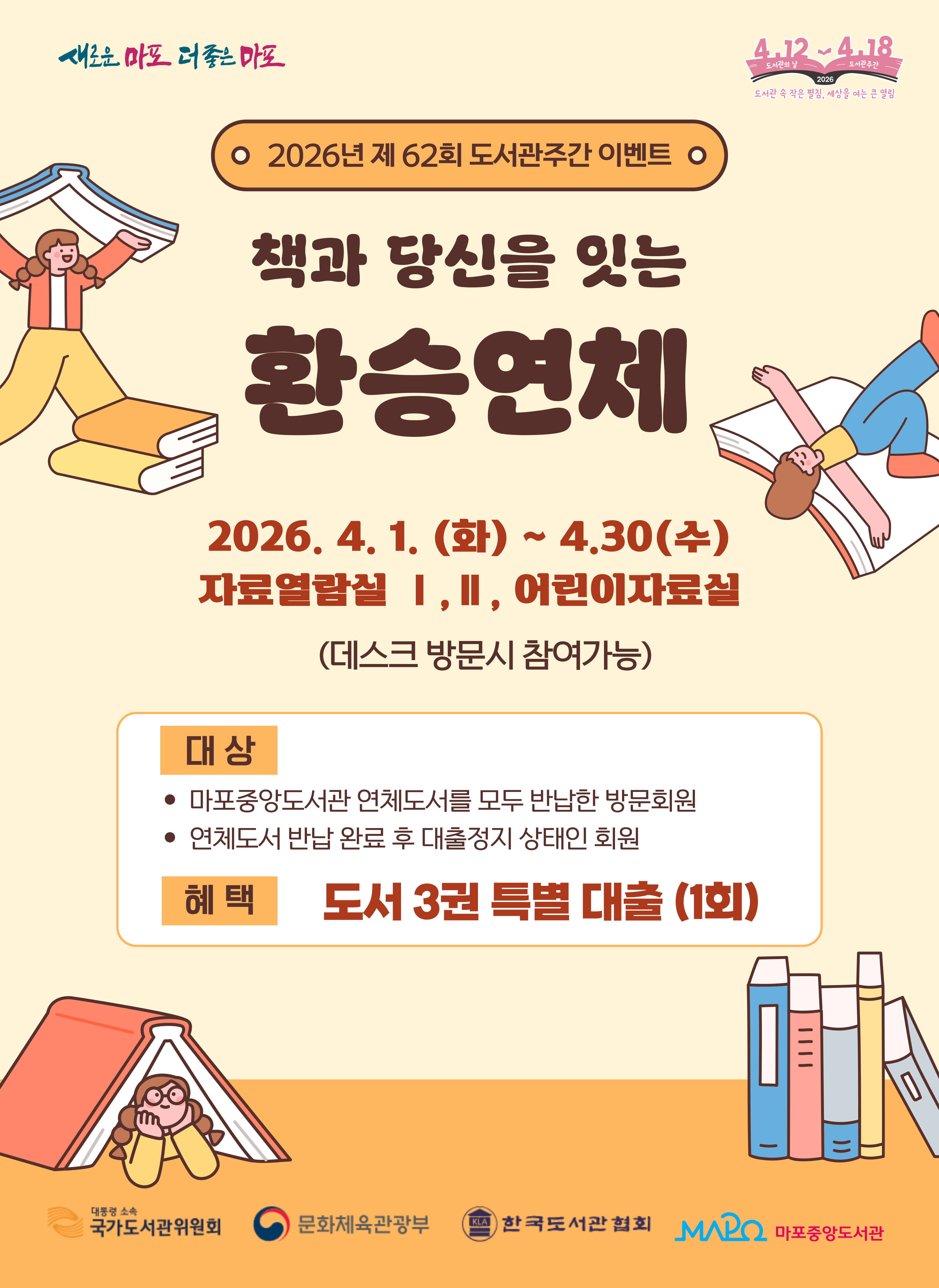 <책과 당신을 잇는 환승연체> 2026년 제62회 도서관주간을 맞이하여 대출정지상태인 회원과 연체도서를 완납한 회원에게 특별대출 3권을 해드리오니 많은 참여바랍니다. (1회 한정) ■ 기 간 : 2026.4.1.~4.30. ■ 장 소 : 어린이자료실, 자료열람실Ⅰ,자료열림실Ⅱ ◆ 문의 : ☎02-3153-5857 |