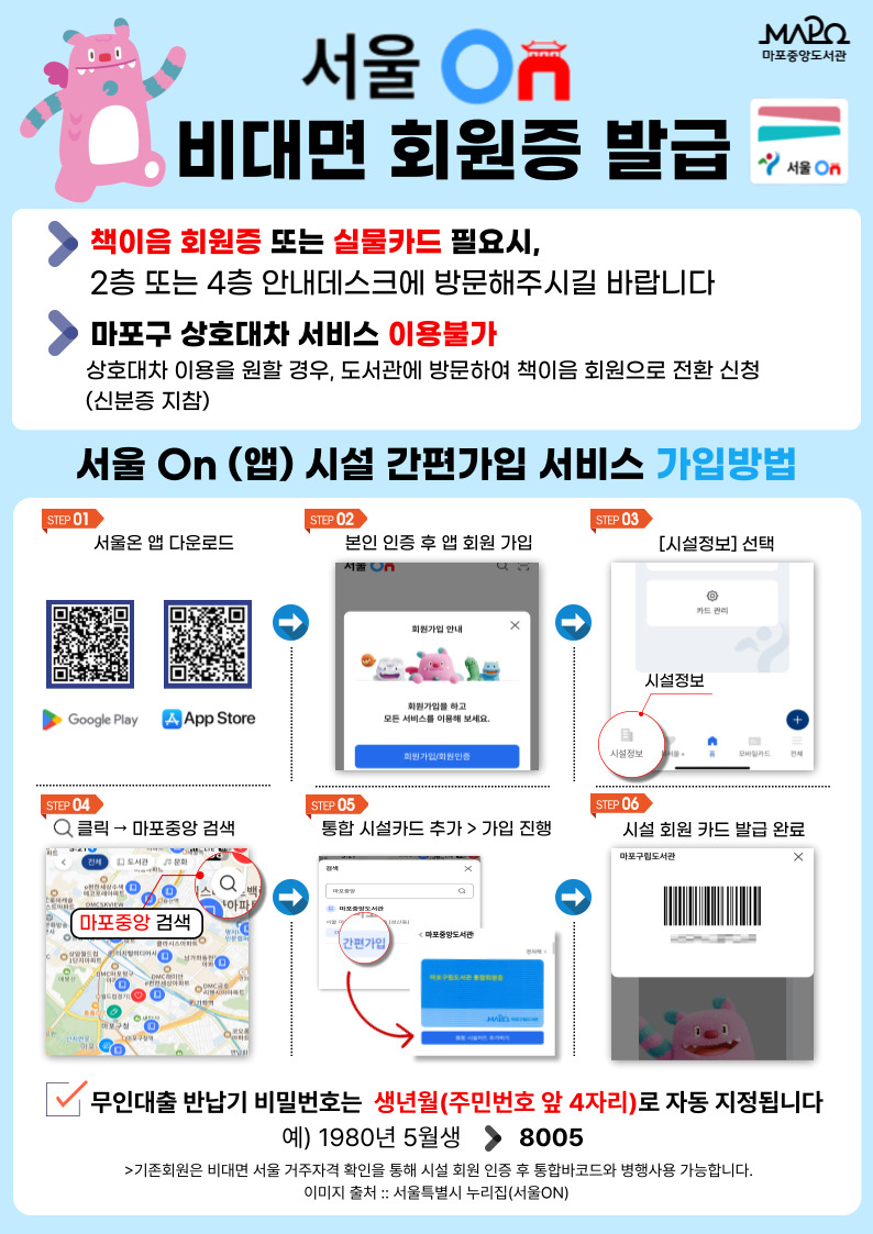 도서관 가입 : [시설카드 추가] 클릭 → 상단 오른쪽 돋보기 클릭 → ‘도서관명’ 검색 및 선택 → [통합 시설카드 추가하기] 클릭 → 마포구립도서관 약관동의 및 아이디 등 생성