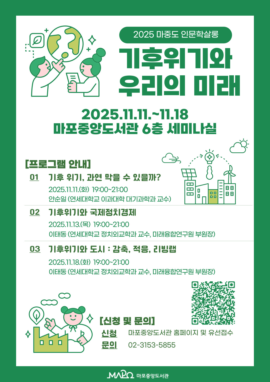 ■ 운영개요 ㅇ 강의명 : [2025년 하반기 마중도 인문학 살롱] 기후위기와 우리의 미래 ■ 신청안내 ■ 문의 : 마포중앙도서관 도서관운영팀 (02)3153-5855 * 불참 시, 프로그램 전날까지 취소 연락바랍니다.  |