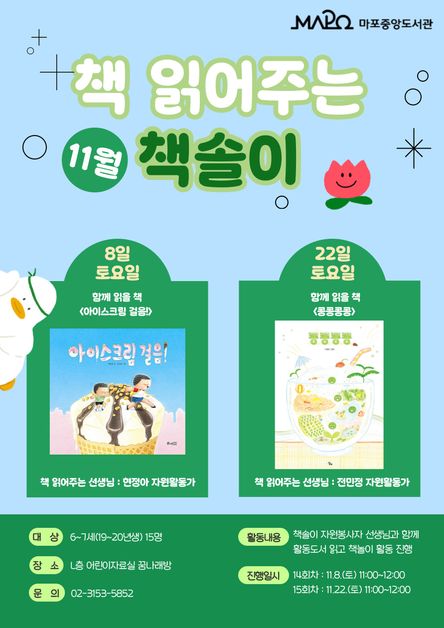 *자녀 성함으로 신청해주세요* <(유아) 책 읽어주는 책솔이 15회차> ■ 일시 : 2025. 11. 22. 토요일 11:00~12:00 2025년 연간일정은 행사정보에서 확인가능합니다. (문화행사마당>행사정보) ■ 장소 : 마포중앙도서관 L층 어린이자료실 꿈나래방 ■ 대상 : 6~7세 어린이(19~20년생) 15명 ■ 활동 : 「콩콩콩콩」그림책 읽고, 책 놀이 활동 진행 ■ 문의 : 02-3153-5852 ■ 참고사항   - 불참 시, 프로그램 전날까지 취소 연락바랍니다.  |