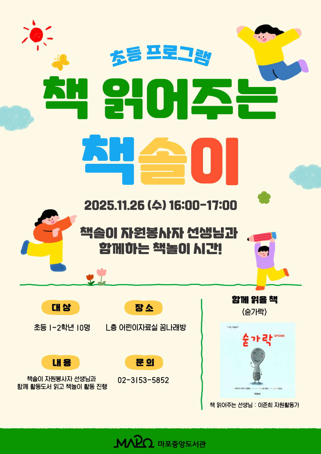*자녀 성함으로 신청해주세요* <책 읽어주는 책솔이 '초등' 5회차> ■ 일시 : 2025. 11. 26. 수요일 16:00~17:00 ■ 장소 : 마포중앙도서관 L층 어린이자료실 꿈나래방 ■ 대상 : 초등 1~2학년 10명 ■ 활동 : 「숟가락」함께 읽고, 책 놀이 활동 진행 ■ 문의 : 02-3153-5852 ■ 참고사항 - 불참 시, 프로그램 전날까지 취소 연락바랍니다. |
