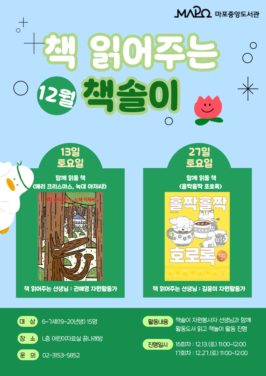 *자녀 성함으로 신청해주세요* <(유아) 책 읽어주는 책솔이 17회차> ■ 일시 : 2025. 12. 27. 토요일 11:00~12:00 2025년 연간일정은 행사정보에서 확인가능합니다. (문화행사마당>행사정보) ■ 장소 : 마포중앙도서관 L층 어린이자료실 꿈나래방 ■ 대상 : 6~7세 어린이(19~20년생) 15명 ■ 활동 : 「홀짝홀짝 호로록」그림책 읽고, 책 놀이 활동 진행 ■ 문의 : 02-3153-5852 ■ 참고사항 - 불참 시, 프로그램 전날까지 취소 연락바랍니다. |