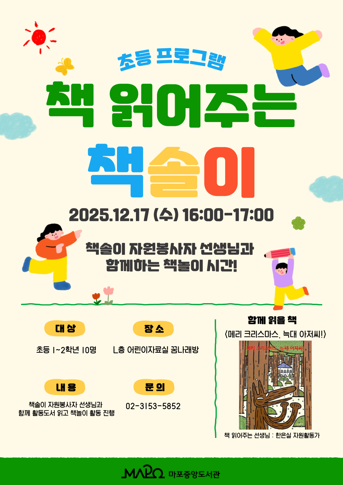 *자녀 성함으로 신청해주세요* <책 읽어주는 책솔이 '초등' 6회차> ■ 일시 : 2025. 12. 17. 수요일 16:00~17:00 ■ 장소 : 마포중앙도서관 L층 어린이자료실 꿈나래방 ■ 대상 : 초등 1~2학년 10명 ■ 활동 : 「메리 크리스마스, 늑대 아저씨!」함께 읽고, 책 놀이 활동 진행 ■ 문의 : 02-3153-5852 ■ 참고사항 - 불참 시, 프로그램 전날까지 취소 연락바랍니다. |