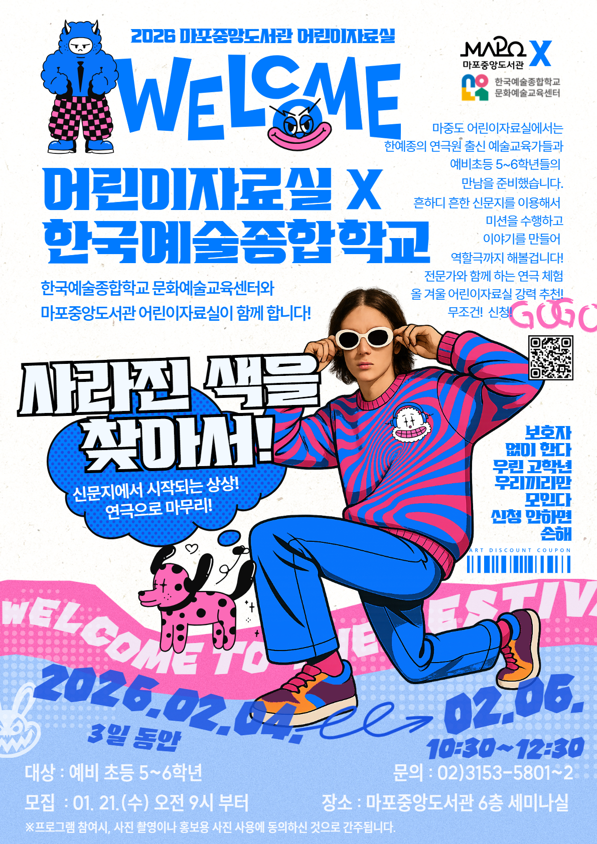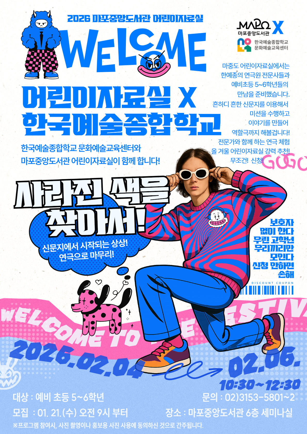 2026 마포중앙도서관 어린이자료실 WELCOME 어린이자료실 X 한국예술종합학교 한국예술종합학교 문화예술교육센터와 마포중앙도관과 어린이자료실이 함께 합니다! 사라진 색을 찾아서! 신문지에서 시작되는 상상! 연극으로 마무리!