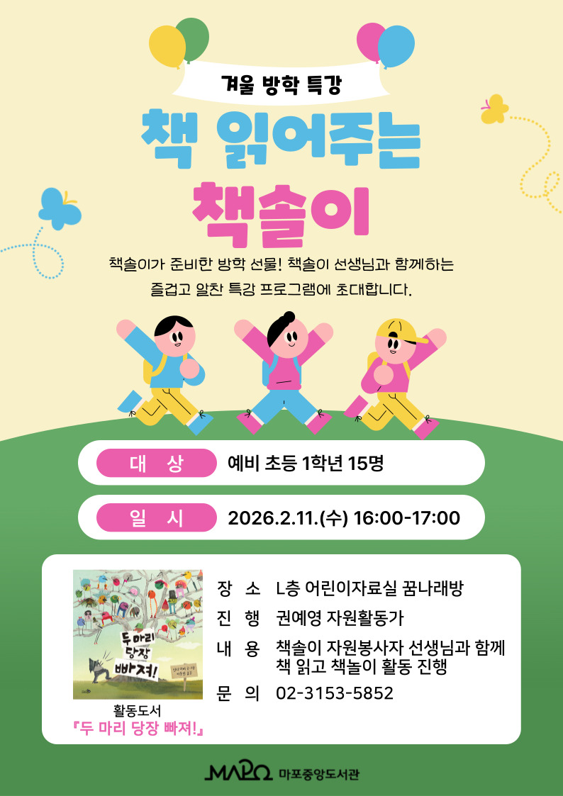*자녀 성함으로 신청해주세요* 겨울 방학을 맞아 책솔이 선생님과 함께하는 즐겁고 알찬 특강 프로그램을 준비하였습니다! 겨울 방학 특강 <책 읽어주는 책솔이> ■ 일시 2026. 2. 11. 수요일 16:00~17:00 ■ 장소 : 마포중앙도서관 L층 어린이자료실 꿈나래방 ■ 대상 : 예비 초등 1학년 15명 ■ 활동 : 책솔이(권예영 자원활동가)선생님과「두 마리 당장 빠져!」함께 읽고, 책 놀이 활동 진행 ※내부 사정에 따라 활동 도서 및 내용이 변경될 수 있습니다. ■ 활동도서 : 「두 마리 당장 빠져!」 ■ 문의 : 02-3153-5852 ■ 참고사항 - 불참 시, 프로그램 전날까지 취소 연락바랍니다. |