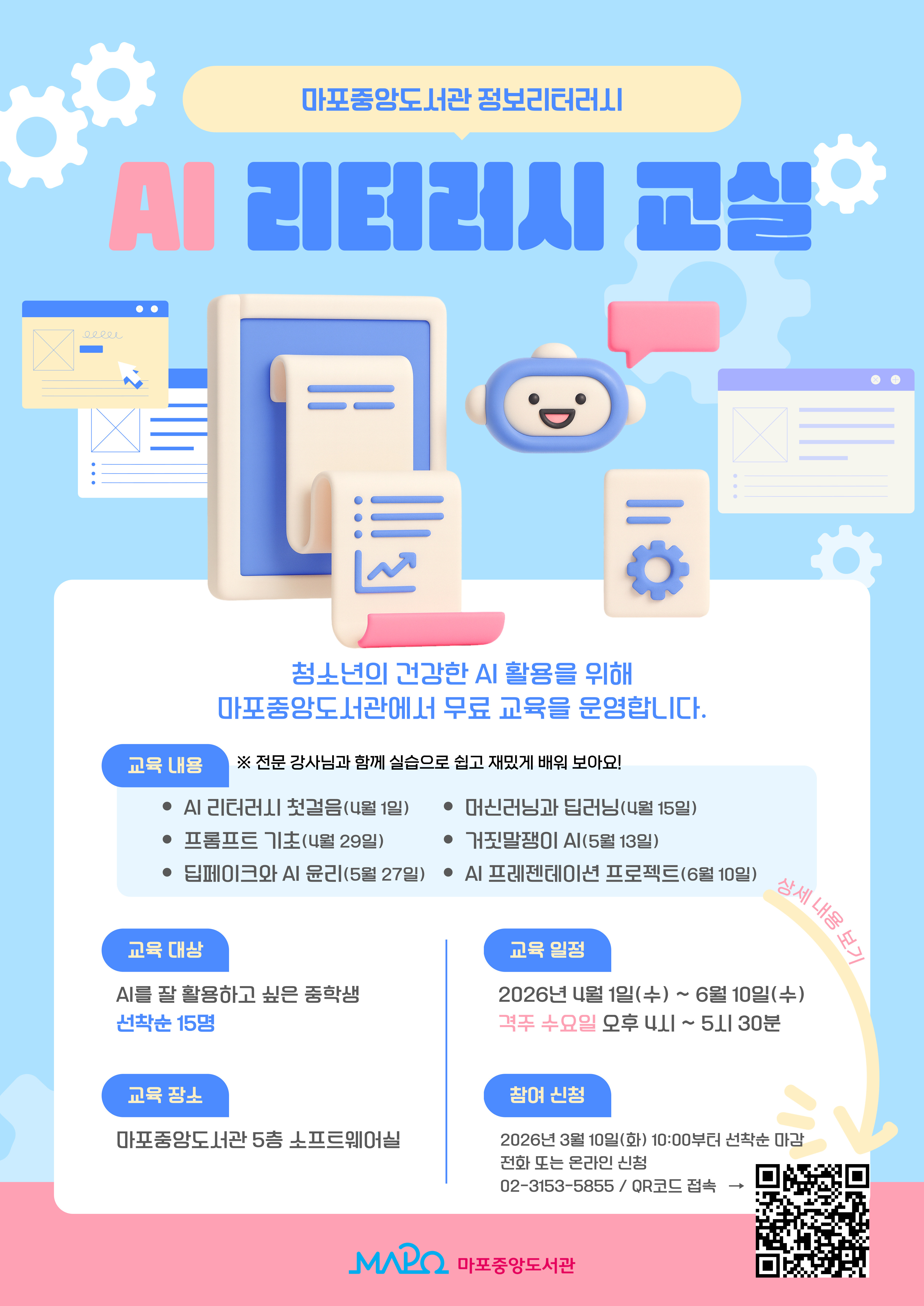 ㅇ 일 시 : 2026. 4.1.(수), 4.15.(수), 4.29.(수), 5.13.(수), 5.27일, 6.10.(수) 16:00 ~ 17:30 - 6회차 모두 참석 가능한 분만 신청해주세요 ㅇ 장 소 : 마포중앙도서관 5층 소프트웨어실 ㅇ 대 상 : 중학생 ㅇ 내 용 : AI 리터러시 첫걸음, 머신러닝과 딥러닝, 프롬프트 기초, 거짓말쟁이 AI, 딥페이크와 AI 윤리, AI 프레젠테이션 프로젝트 ㅇ 준 비 물 : 필기구 (※ 이외 필요 시 참여자 별도 안내 예정)