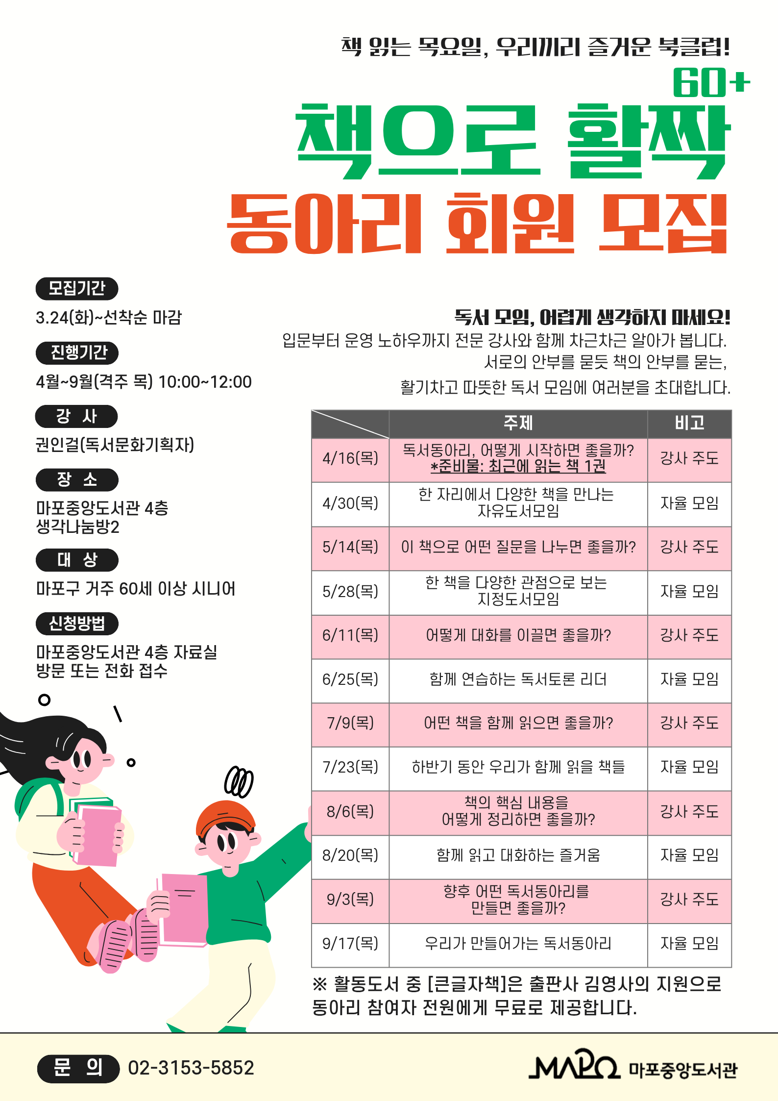 ■ 운영개요 2026 어르신 독서동아리 「책으로 활짝 60+」 ㅇ 기 간 : 2026. 4. 16. ~ 9. 17.(격주 목) (총 12회) ※ 12회 모임 모두 참여하실 수 있는 분들 지원 바랍니다. - 시간: 10:00 ~ 12:00 (120분) ㅇ 강 사 : 권인걸(독서문화기획자) ㅇ 대 상 : 마포구 거주 60세 이상 시니어 10명 ㅇ 장 소 : 마포중앙도서관 4층 생각나눔방2 ㅇ 내 용 독서 모임, 어렵게 생각하지 마세요! ※ 활동 도서 중 '큰글자책'은 출판사 김영사의 지원으로 참여자 전원에게 무료 제공합니다.