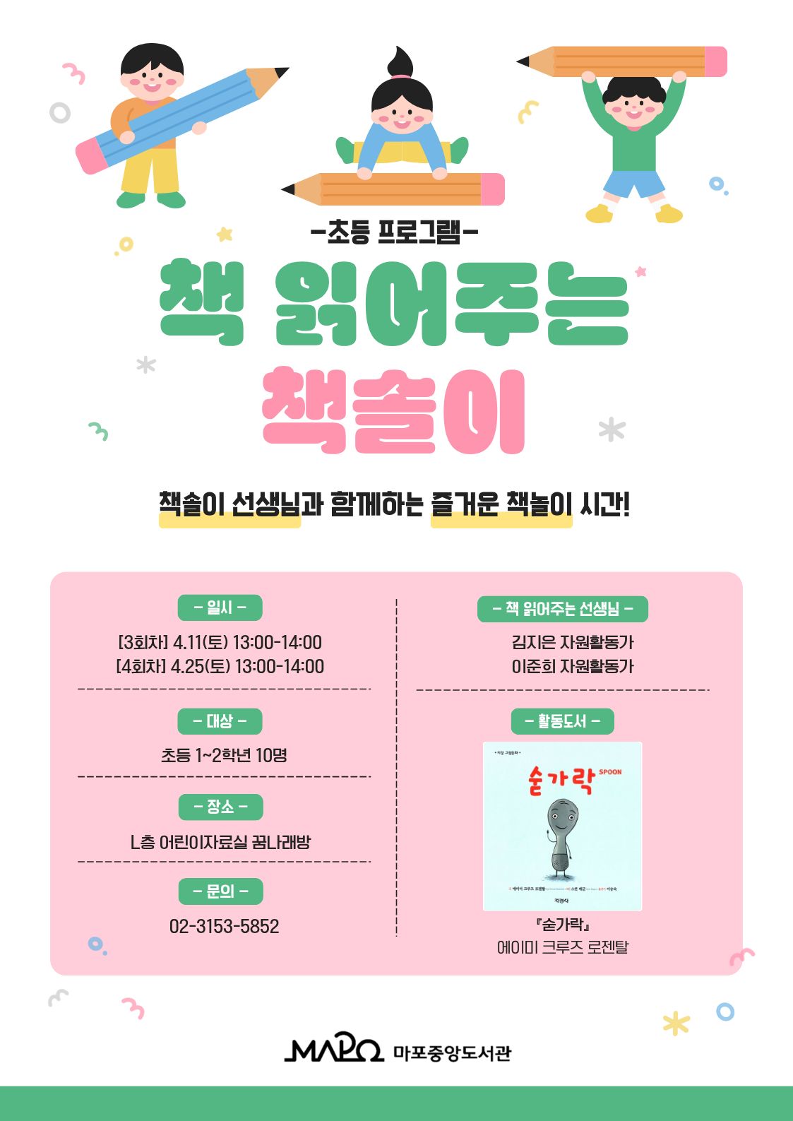 *자녀 성함으로 신청해주세요* ★월별 1회 신청 가능★ 🔅초등🔅 [책 읽어주는 책솔이 3회차] ■ 일시 : 2026. 4. 11. 토요일 13:00~14:00 ■ 장소 : 마포중앙도서관 L층 어린이자료실 꿈나래방 ■ 대상 : 초등 1~2학년 10명 ■ 활동 : 「숟가락」함께 읽고, 책 놀이 활동 진행 ■ 자원활동가 : 김지은 자원활동가 ■ 문의 : 02-3153-5852 ■ 참고사항 - 불참 시, 프로그램 전날까지 취소 연락바랍니다. |
