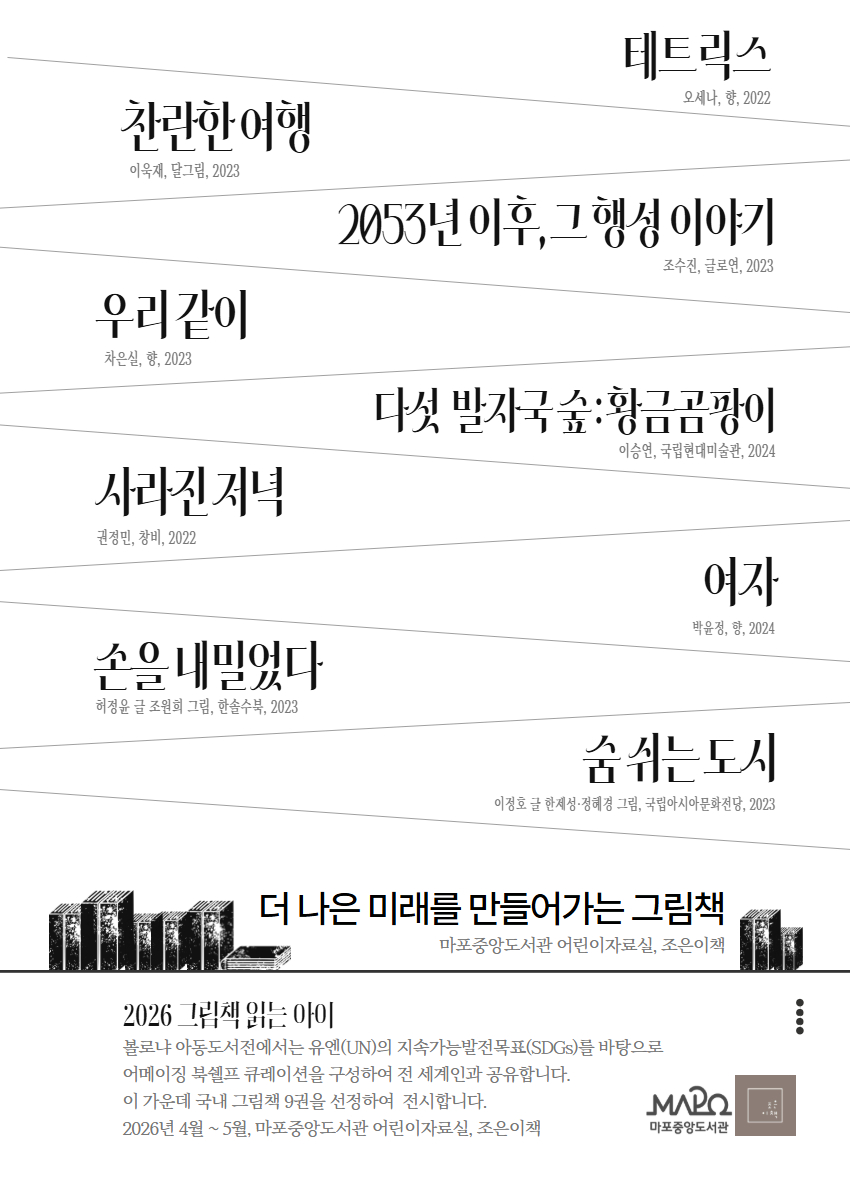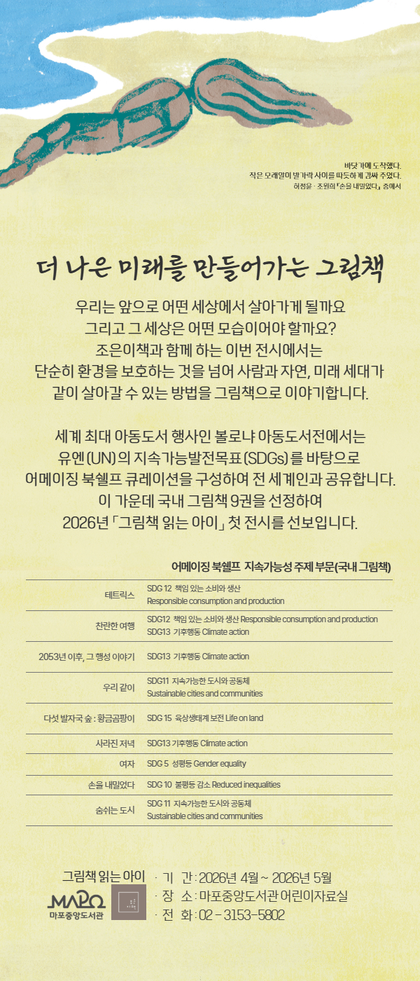 볼로냐 아동도서전에서는 유엔(UN)의 지속가능발전목표(SDGs)를 바탕으로 어메이징 북쉘프 큐레이션을 구성하여 전 세계인과 공유합니다. 이 가운데 국내 그림책 9권을 선정하여 전시합니다. 2026년 4월 ~ 5월, 마포중앙도서관 어린이자료실, 조은이책