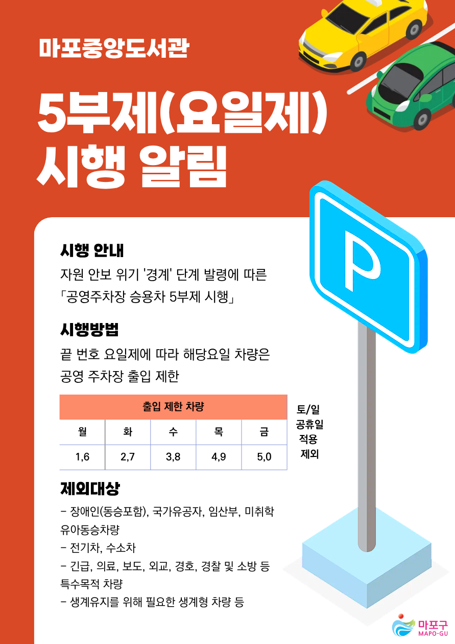 [공지] 마포중앙도서관 주차장 승용차 5부제 시행 알림