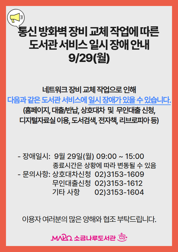 | 제목 | (작업완료) 네트워크 방화벽 장비 교체 작업에 따른 도서관 서비스 일시 장애 안내_9/29(월) |