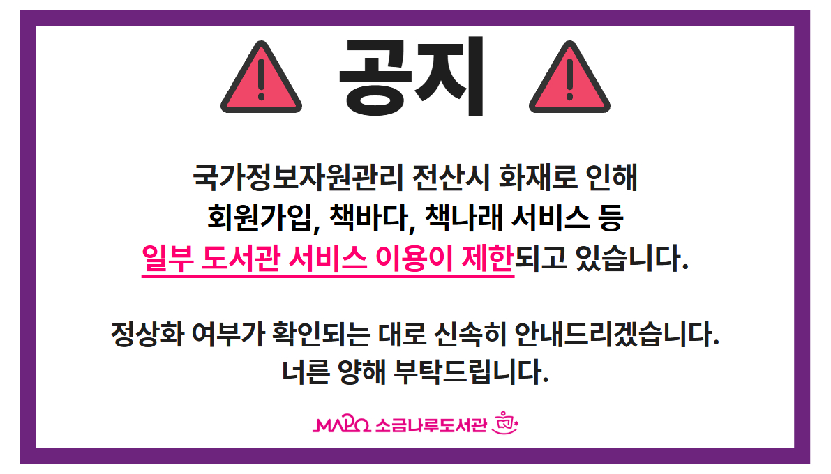 국가정보자원관리 전산시 화재로 인해 회원가입, 책바다, 책나래 서비스 등 정상화 여부가 확인되는 대로 신속히 안내드리겠습니다. |