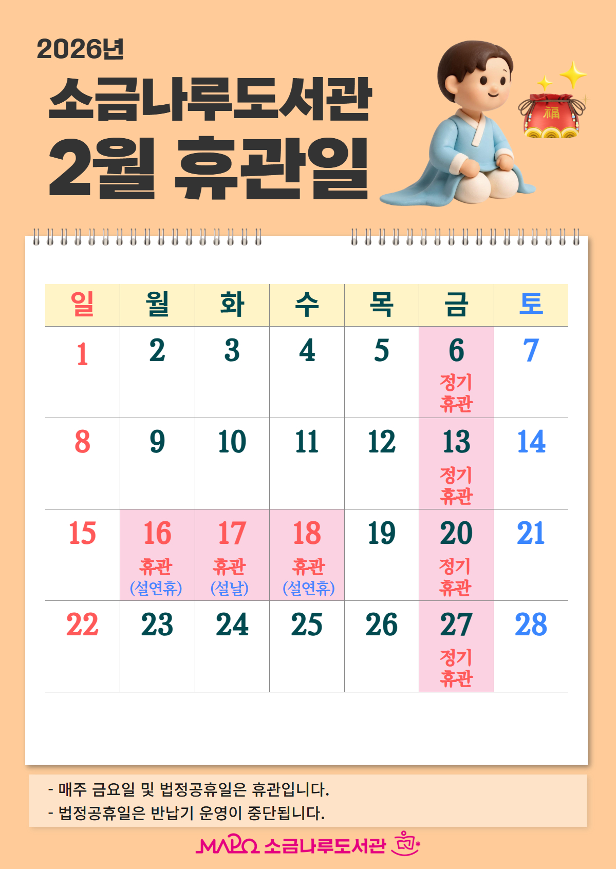 [2026년 2월 소금나루도서관 휴관일 안내]