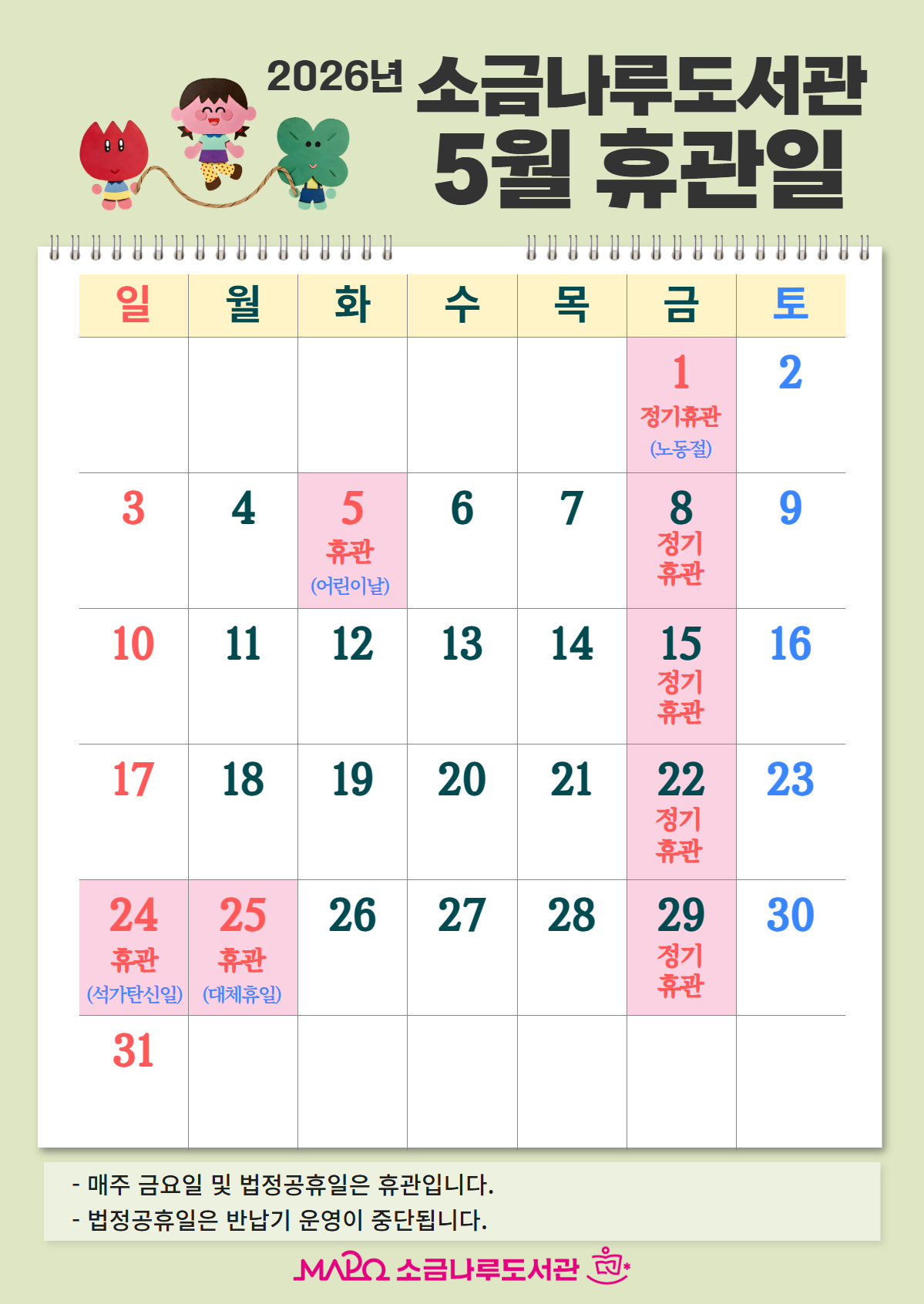 [2026년 5월 소금나루도서관 휴관일 안내] 정기휴관일은 매주 금요일로 5월 1일, 8일, 15일, 22일, 29일이며, 법정공휴일은 근로자의 날(5월 1일), 어린이날(5월 5일), 석가탄신일(5월 24일), 대체휴일(5월 25일)입니다. ※매주 금요일 및 법정공휴일은 휴관입니다.