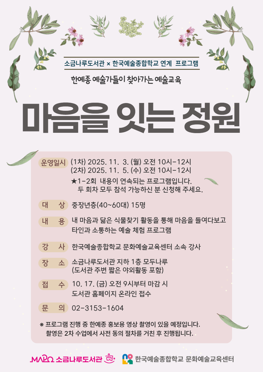 소금나루도서관X한국예술종합학교 연계 프로그램 한예종 예술가들이 찾아가는 예술교육 마음을 잇는 정원 -운영일시 (1차) 2025. 11. 3. (월) 오전 10시-12시 ★1-2회 내용이 연속되는 프로그램입니다. 두 회차 모두 참석 가능하신 분 신청해 주세요. -대상: 중장년층(40~60대) 15명 -내용: 내 마음과 닮은 식물찾기 활동을 통해 마음을 들여다보고 타인과 소통하는 예술 체험 프로그램 -강사: 한국예술종합학교 문화예술교육센터 소속 강사 -장소: 소금나루도서관 지하 1층 모두나루 (도서관 주변 짧은 야외활동 포함) -접수: 10. 17. (금) 오전 9시부터 마감 시 / 도서관 홈페이지 온라인 접수 -문의: 02-3153-1604 ※ 프로그램 진행 중 한예종 홍보용 영상 촬영이 있을 예정입니다. |