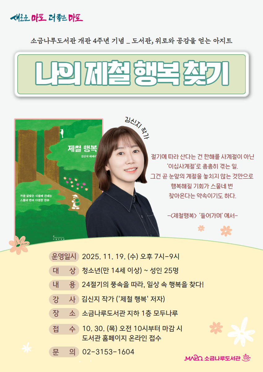 프로그램명 [개관4주년] 나의 제철 행복 찾기('제철 행복' 김신지 작가 강연) 대기자접수중