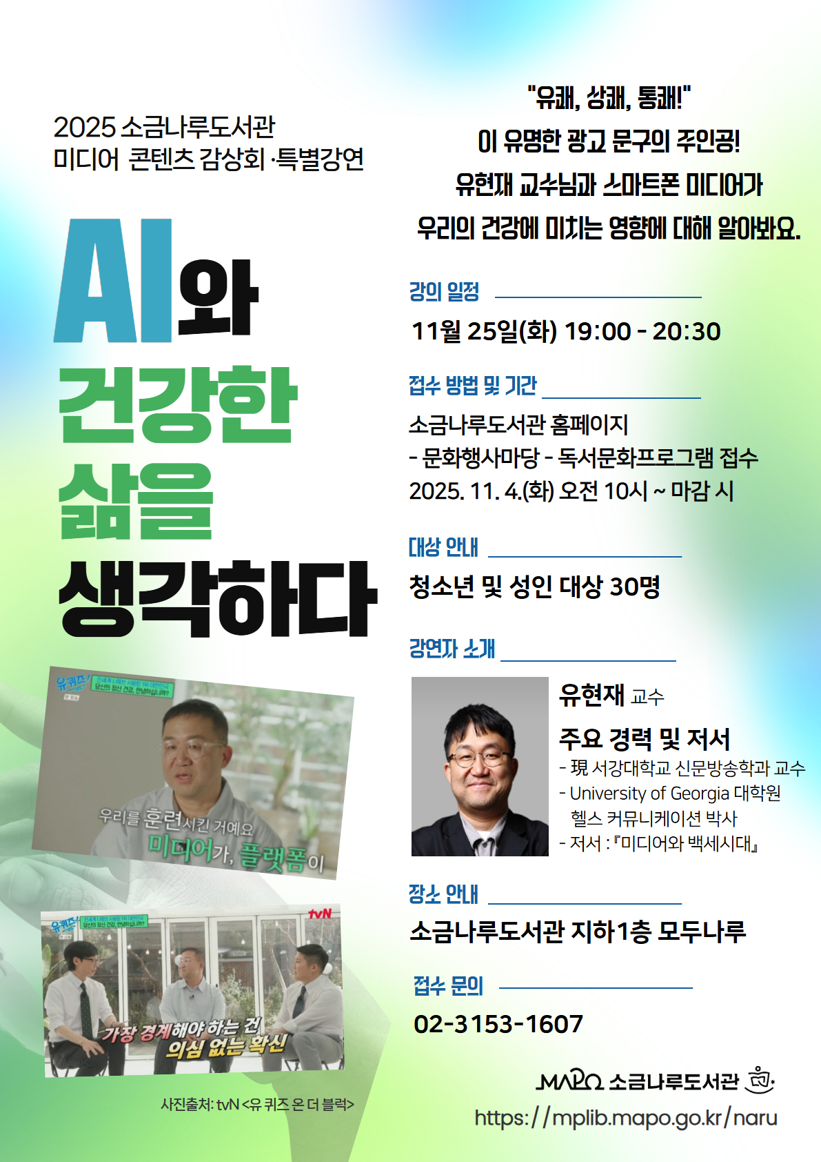 ㅇ 프로그램명 : 미디어 특별강연 「AI와 건강한 삶을 생각하다」 ㅇ 운영기간 : 2025년 11월 25일(화) 저녁 7시 ~ 8시 30분 ㅇ 운영대상 : 청소년(14세 이상) 및 성인 40명 ㅇ 장 소 : 지하1층 모두나루(다목적실) ㅇ 강 사 : 유현재 (現 서강대학교 신문방송학과 교수) ㅇ 참여방법 : 2025년 11월 4일(화) 오전 10시부터 도서관 홈페이지 (문화행사마당 → 독서문화프로그램)에서 신청 가능
