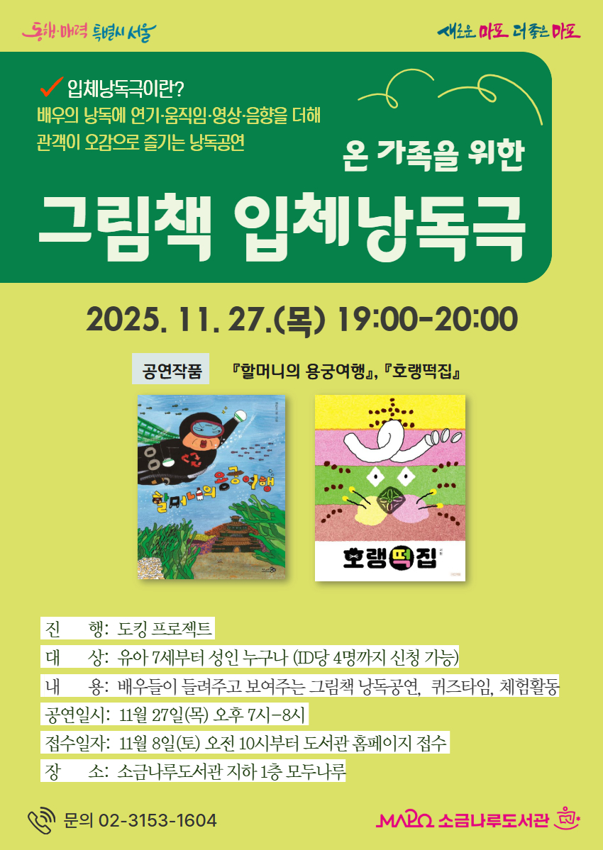 온가족을 위한 입체낭독극 공연작품: 할머니의 용궁여행, 호랭떡집 진 행: 도킹 프로젝트 문 의: 02-3153-1604 |