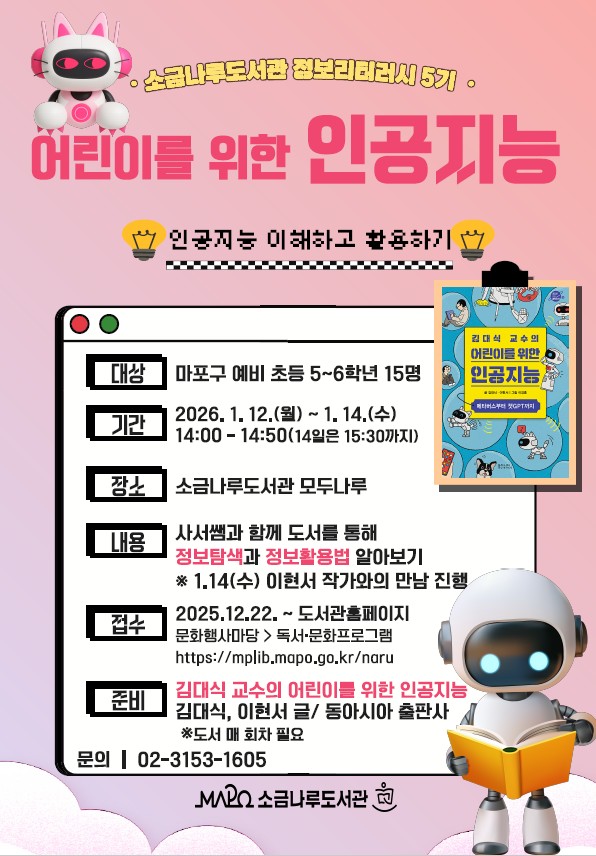 *일시│2026. 1. 12.(월) - 1. 14.(수) *3회차 모두 참석 *시간│14:00 - 14:50 ( 1.14.작가만남은 14:00-15:30) *대상│마포구 예비 초등 5-6학년 15명 *장소│소금나루도서관 모두나루 강의실 *내용│사서쌤과 도서를 통해 정보탐색과 정보 활용법 알아보고 저자(이현서) 만남 *준비│김대식 교수의 어린이를 위한 인공지능 / 동아시아 출판사