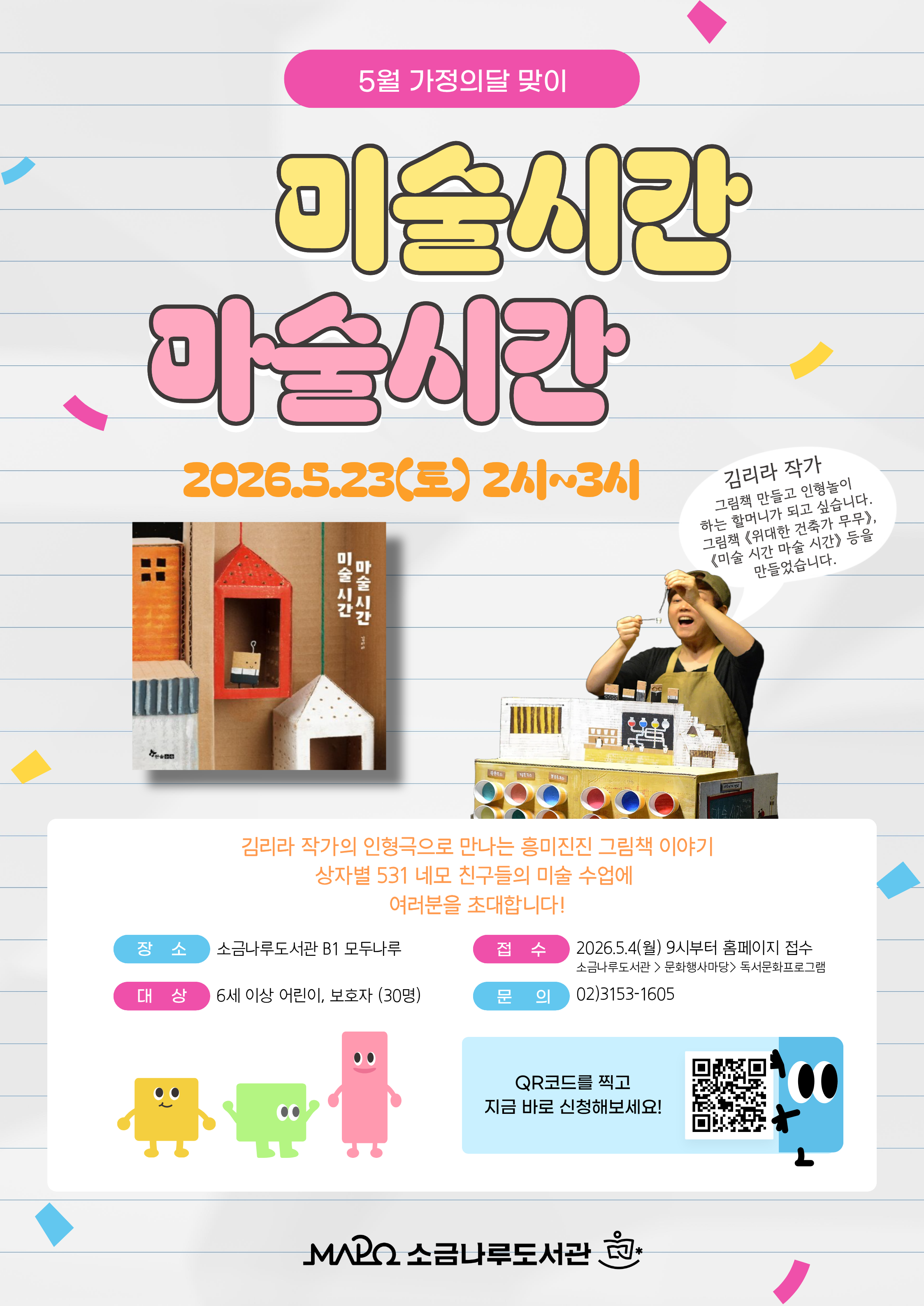 ■ 일시 : 2026. 5. 23.(토) 오전 14:00 - 15:00 ■ 내용 김리라 작가의 인형극으로 만나는 흥미진진 그림책 이야기 상자별 531 네모 친구들의 미술 수업에 여러분을 초대합니다! ■ 강사 : 김리라 작가 ■ 대상 : 6세 이상 어린이, 보호자 (30명) ■ 장소 : 소금나루도서관 모두나루 강의실 ■ 접수 : 2026.5.4(월) 9시부터 홈페이지 접수 ■ 문의 : 02-3153-1605