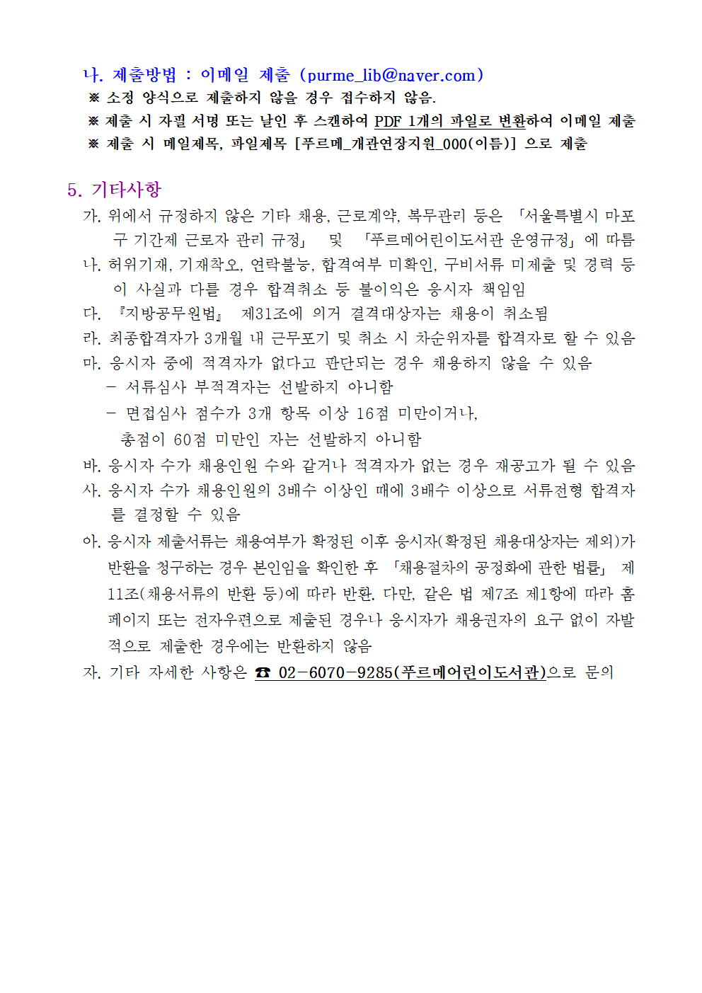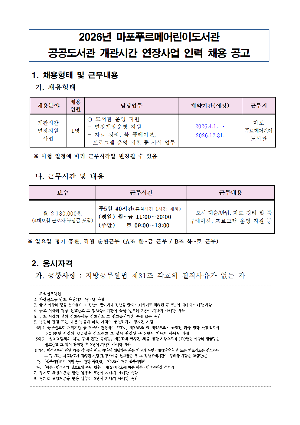 마포푸르메어린이도서관 개관시간 연장사업 채용 공고(~3/19)