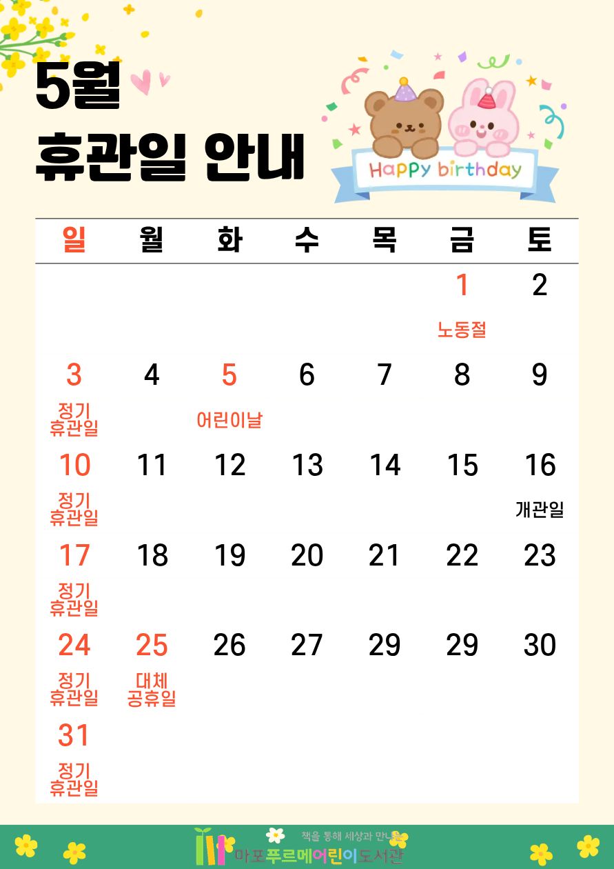 5월 휴관일 안내 5월 휴관일을 다음과 같이 안내드리오니 이용에 착오없으시기 바랍니다. 반납일이 휴관일인 경우 다음날로 자동 연장됩니다. (도서관 휴관일 : 일요일 및 법정공휴일) * 운영시간 외 반납함 이용 가능합니다. 반납함 운영시간 : 평일 및 토요일 오후 18:00 ~ 익일 오전 09:00 * 2일 이상 휴관일 경우, 반납함이 넘칠 수 있으니 무리하게 반납함에 넣지마시고 운영일에 반납해주세요. * 도서가 반납함 밖으로 떨어지거나 반납함 주위에 도서를 놓는 등의 상황으로 도서가 분실되는 경우 도서관에서는 책임을 질 수 없음을 알려드립니다. |