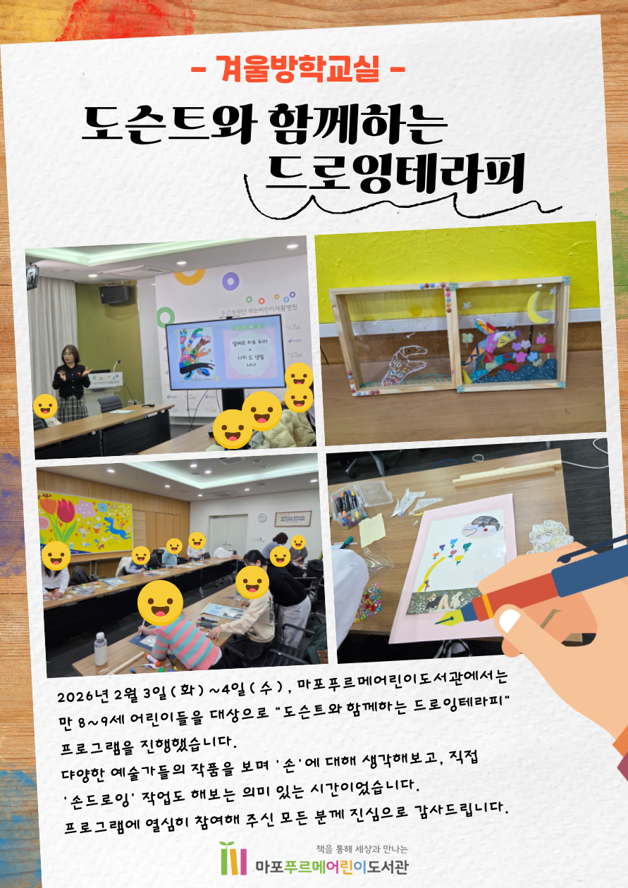 2026년 2월 3일(화)~4일(수), 마포푸르메어린이도서관에서는 만 8~9세 어린이들을 대상으로 "도슨트와 함께하는 드로잉테라피" 프로그램을 진행했습니다.