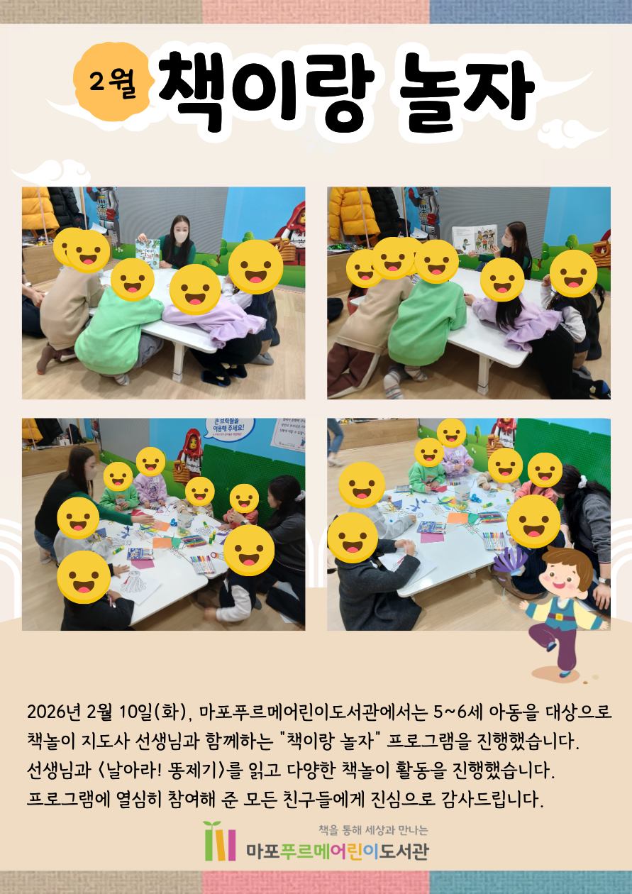 2026년 2월 10일(화), 마포푸르메어린이도서관에서는 책놀이 지도사 선생님과 함께하는 "책이랑 놀자" 프로그램을 진행했습니다.