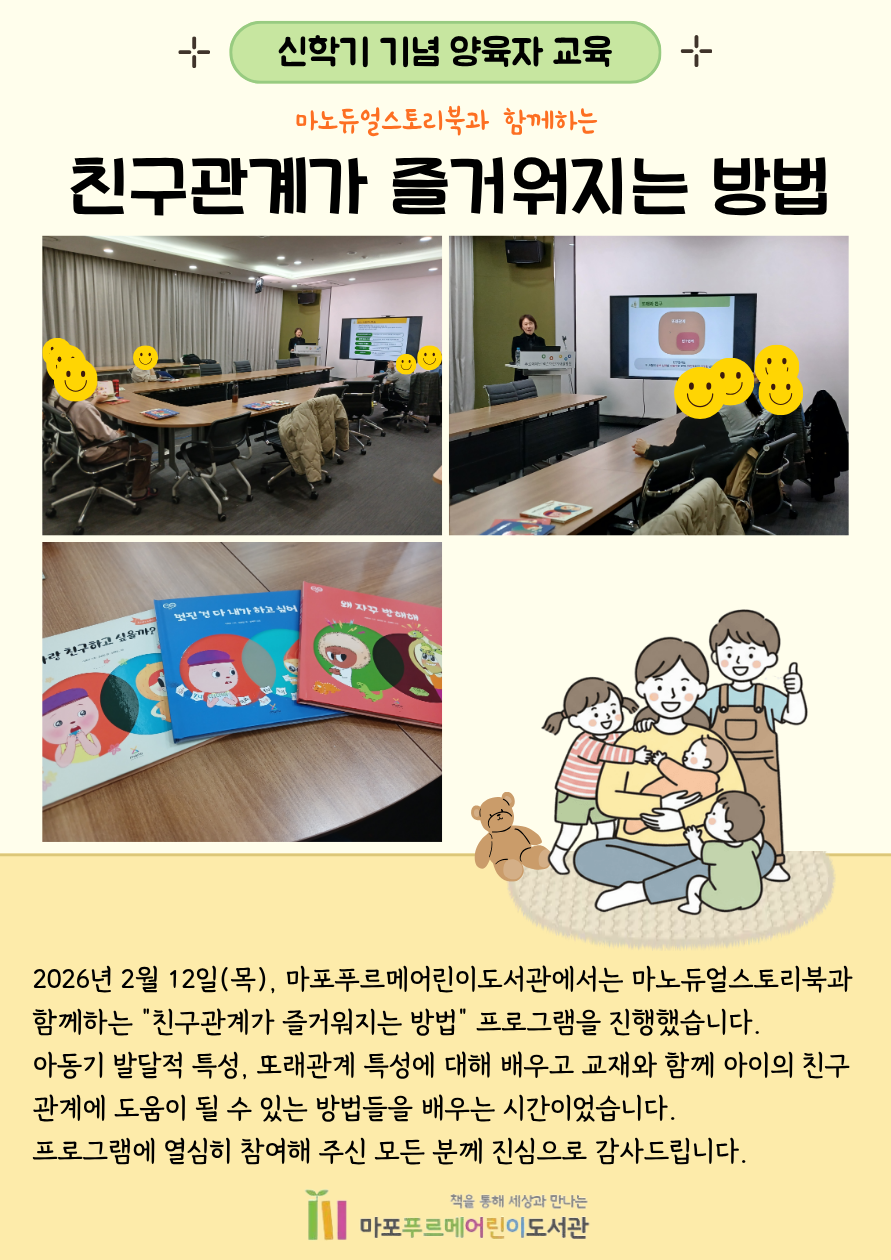2026년 2월 12일(목), 마포푸르메어린이도서관에서는 마노듀얼스토리북과 함께하는 "친구관계가 즐거워지는 방법" 프로그램을 진행했습니다.