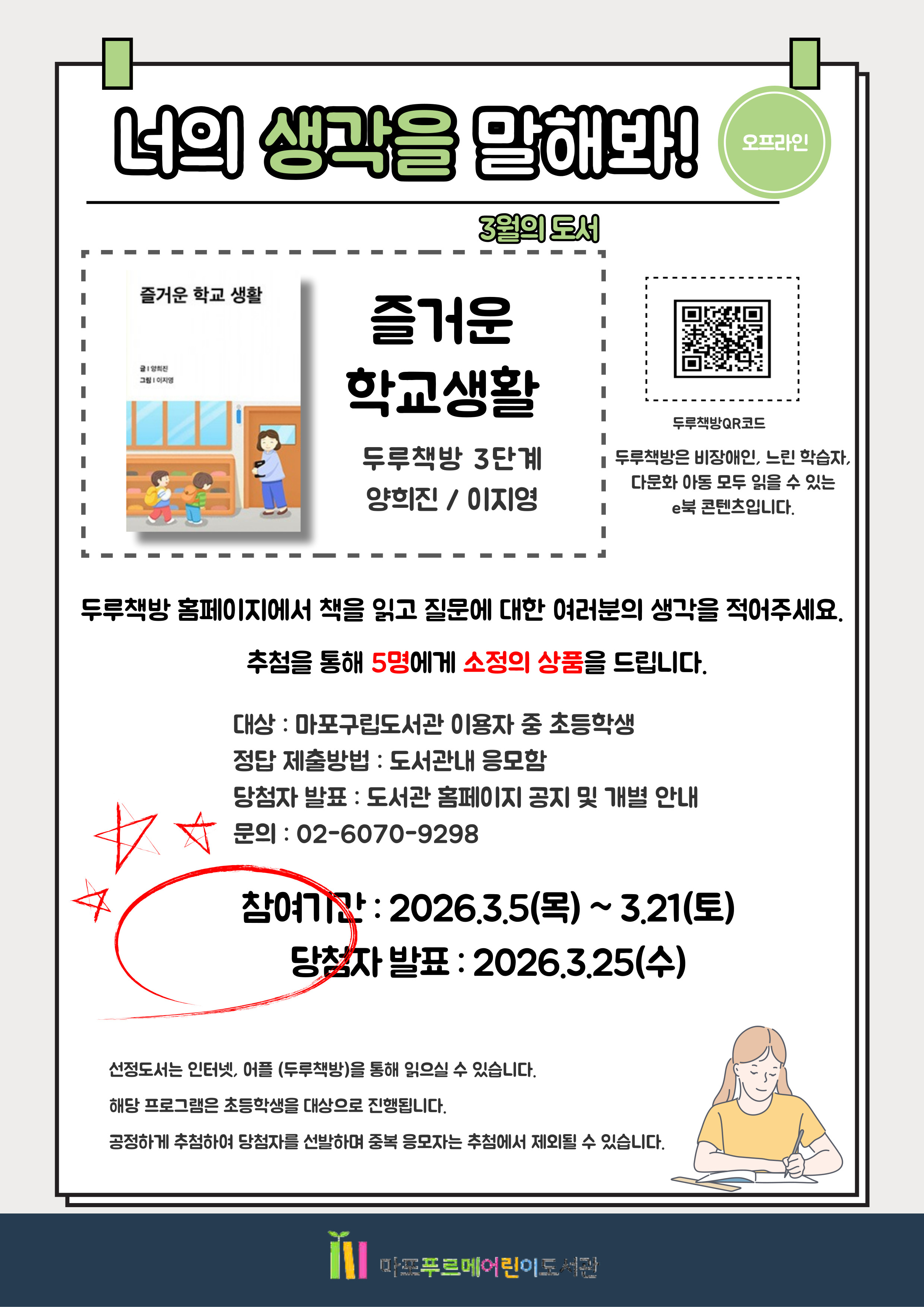 3월 너의 생각을 말해봐 두루책방 홈페이지 및 어플에서 책을 읽고 질문에 대한 여러분의 생각을 적어주세요. 추첨을 통해 5명에게 소정의 상품을 드립니다. - 3월의 책 : 두루책방 3단계 : 즐거운 학교생활 - 대상 : 마포구립도서관 이용자 중 초등학생 - 정답 제출방법 : 도서관 내 응모함 - 문의 : 02-6070-9298 - 참여기간 : 2026.03.05(목) ~ 03.21.(토) - 당첨자 발표 : 2026.03.25.(수) 문화가 있는 날 도서관 홈페이지 공지 및 개별 안내