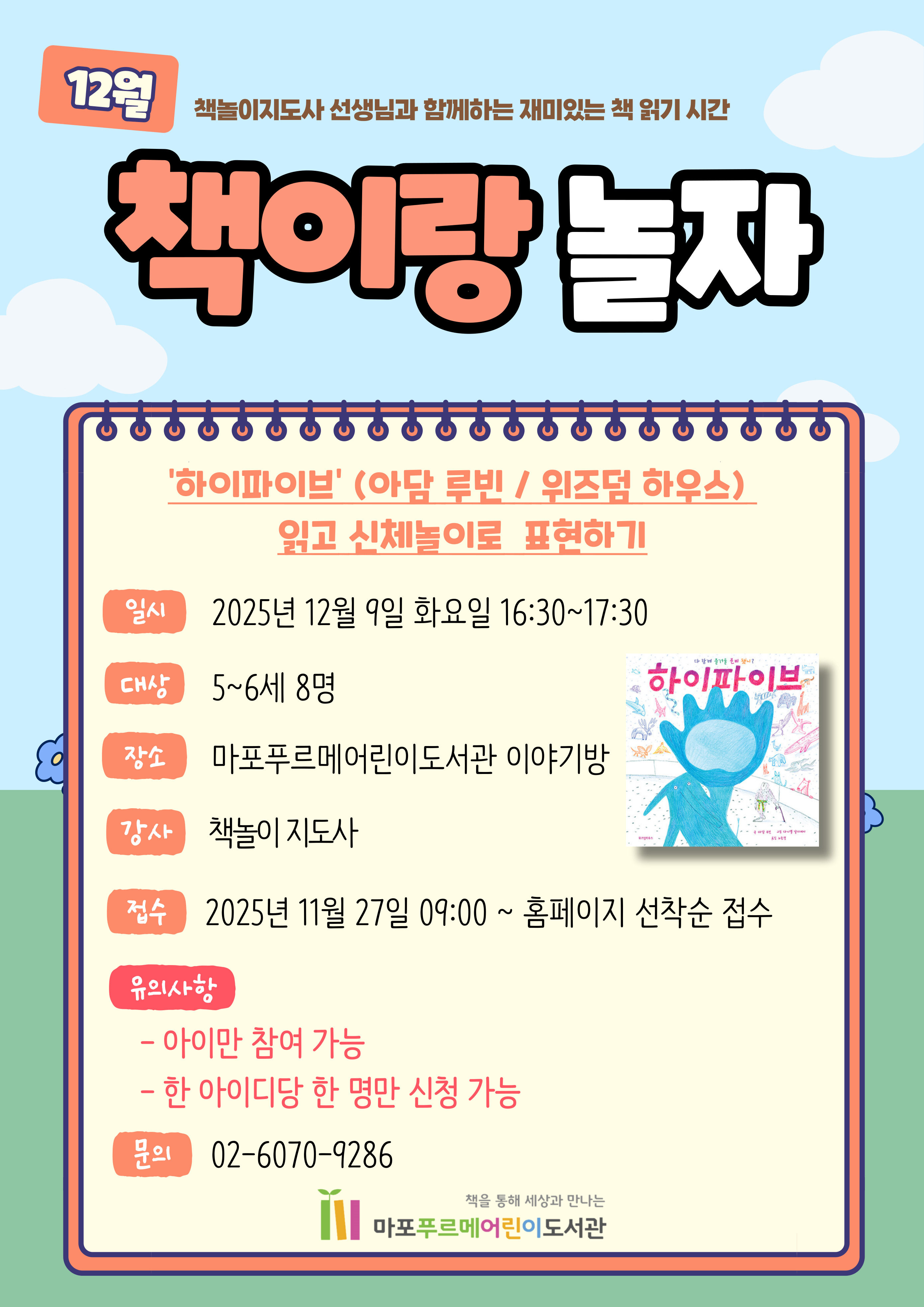 [책놀이지도사 연계 프로그램] 12월 책이랑 놀자 책놀이지도사 선생님과 함께하는 재미있는 책읽기 시간 ○ 도서 및 활동 : '하이파이브' (아담 루빈)를 읽고 신체놀이로 표현하기 ○ 일시 : 2025년 12월 9일 화요일 16:30~17:30 ○ 대상 : 5-6세 8명 ○ 장소 : 마포푸르메어린이도서관 이야기방 ○ 강사 : 책놀이지도사 ○ 접수 : 2025년 11월 27일 09:00 ~ 홈페이지 선착순 접수 ※ 유의사항 - 아이만 참여 가능 - 한 아이디당 한 명만 신청 가능 ☎ 문의 : 02-6070-9286 |