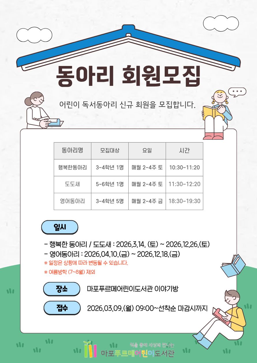 2026년 어린이 독서동아리 (도도새-초등 고학년) 회원 모집 "어린이도서연구회와 함께하는 어린이 독서동아리 도도새의 회원을 모집합니다." ○ 모집대상 : 초등 5~6학년 1명 ○ 일정 : 2026.03.14(토)~12.26(토) 2,4주 토요일 11:30~12:20 ※ 일정은 상황에 따라 변동될 수 있습니다 ※ 여름방학 (7~8월) 제외 ○ 장소 : 도서관 이야기방 ○ 접수 : 2026.03.09(월) 09:00 ~ 홈페이지 선착순 마감시까지 ○ 문의 : 02-6070-9298 |