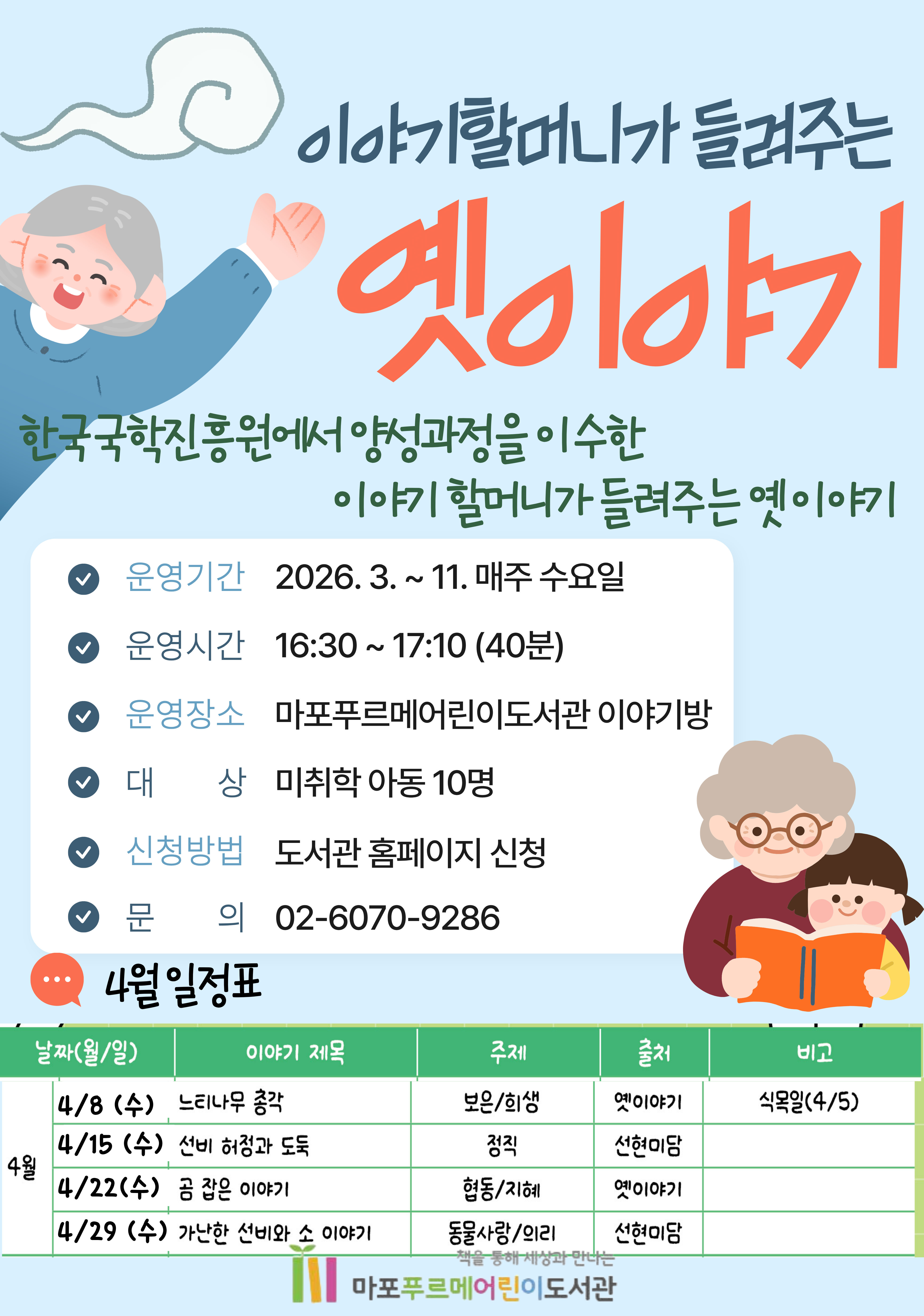 한국국학진흥원과 함께하는 이야기할머니가 들려주는 옛이야기 한국국학진흥원에서 양성과정을 이수한 ✌️이야기할머니✌️가 들려주는 우리 옛이야기 시간입니다. 따로 책을 읽어오지 않아도 됩니다. 매주 수요일에 만나요~🤗🤗 🔸시간 : 2026. 3~11월 매주 수요일(수) 16:30 ~ 17:10 [매주 수요일 진행합니다.] 🔸장소 : 마포푸르메어린이도서관 이야기방 🔸대상 : 미취학 어린이 10명 🔸문의 : 02-6070-9286 (주차는 2시간 무료)