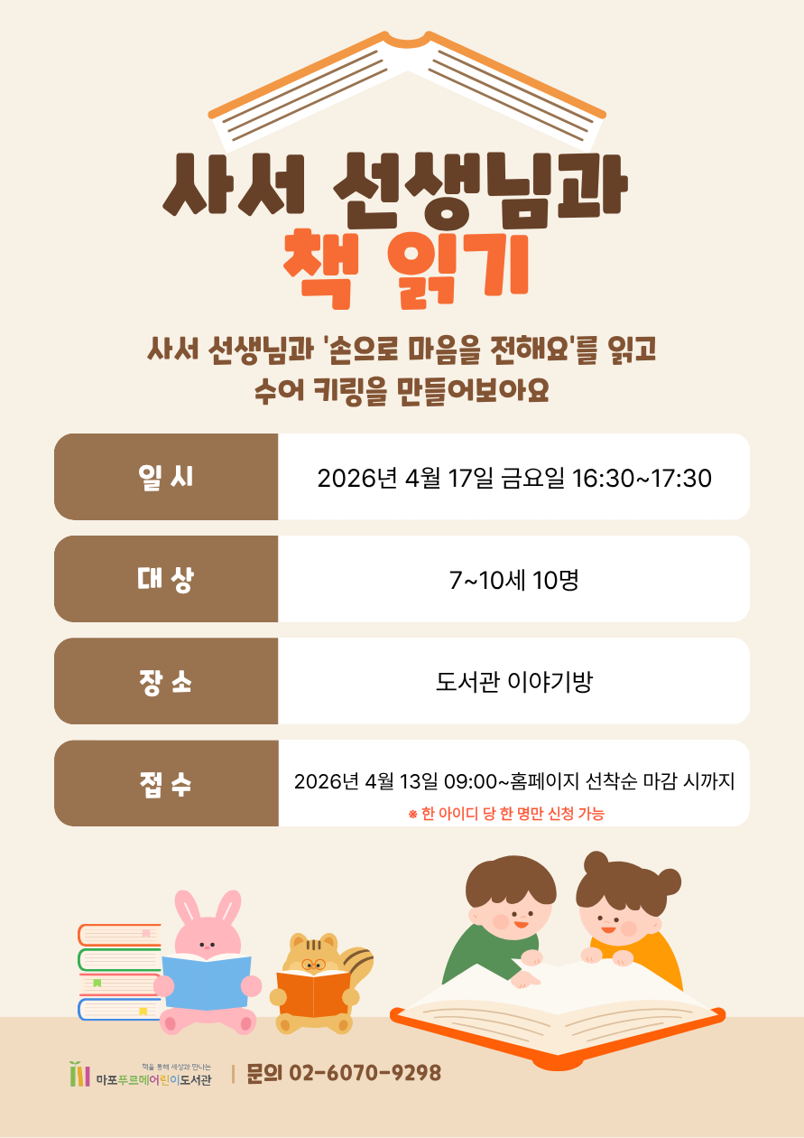 4월 사서 선생님과 책 읽기 (손으로 마음을 전해요) 사서 선생님과 <손으로 마음을 전해요>를 읽고 수어 키링을 만들어보아요. 일시 : 2026년 4월 17일 금요일 16:30~17:30 대상 : 7~10세 10명 장소 : 마포푸르메어린이도서관 이야기방 진행 : 사서 선생님 접수 : 2026년 4월 13일 09:00 ~ 홈페이지 선착순 접수 ※ 한 아이디당 한 명만 신청 가능 문의 : 02-6070-9298 |
