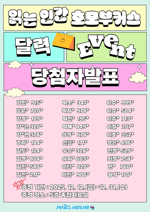 | 제목 | 2026년 읽는 인간 호모부커스 설문조사 달력 이벤트 당첨자 |