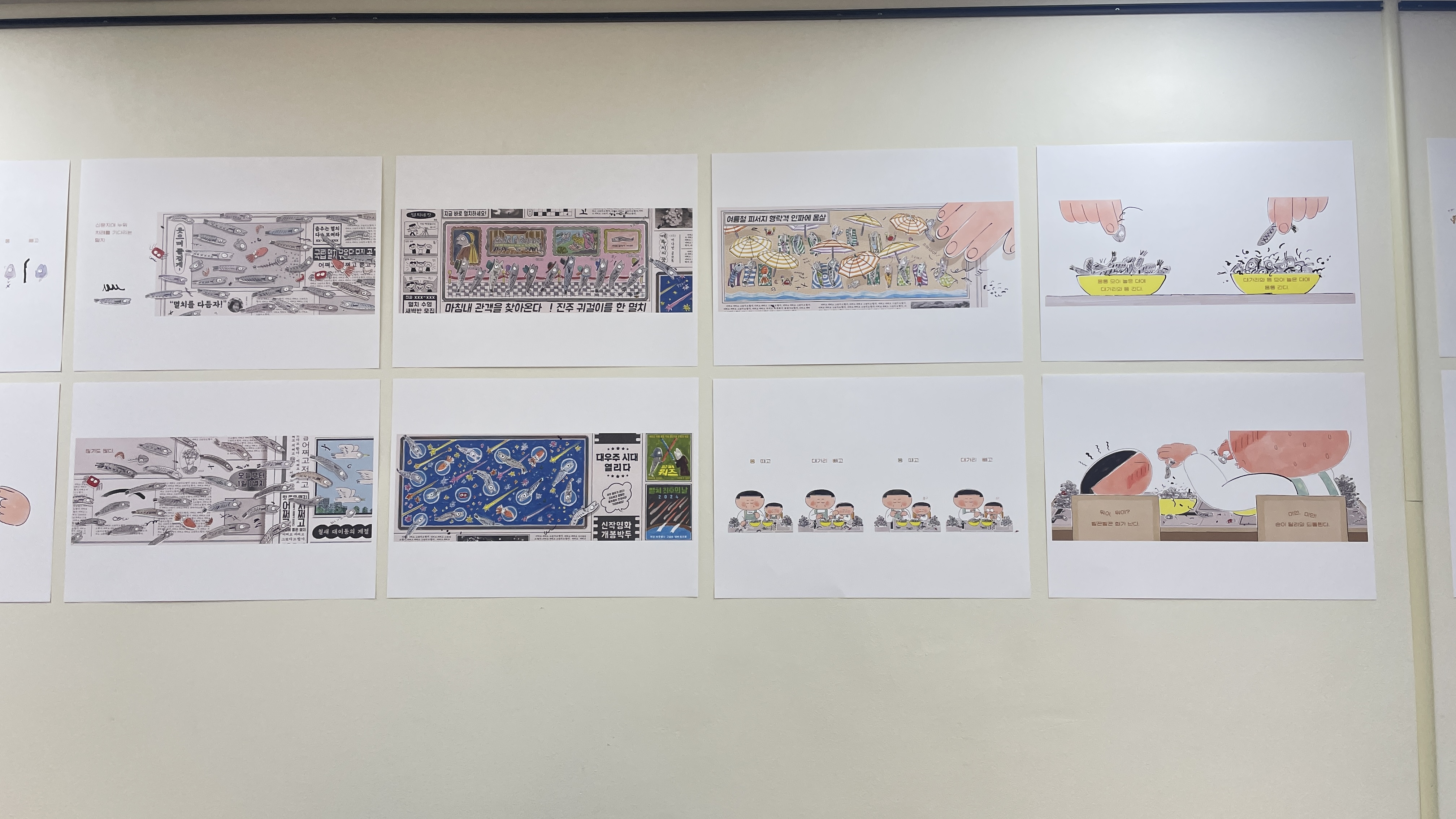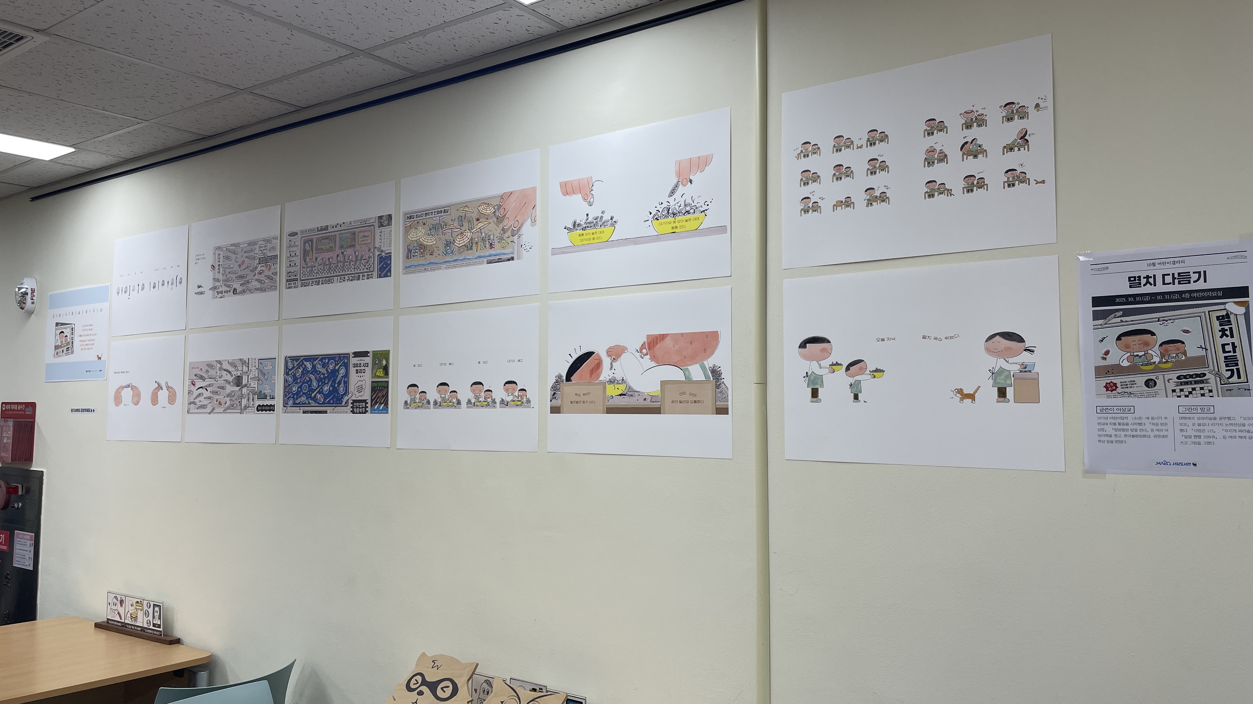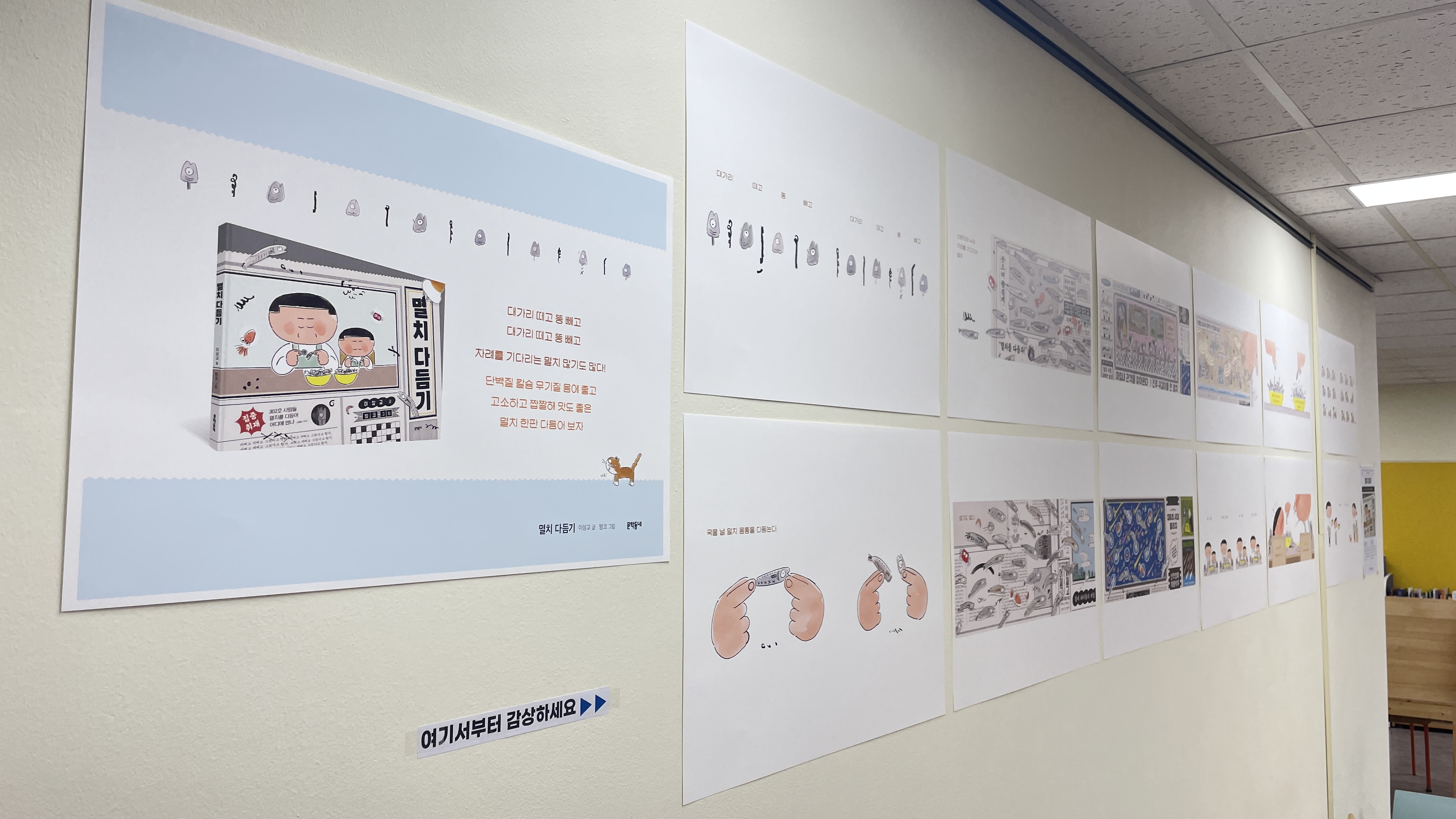 이상교 작가가 쓰고, 밤코 작가가 그린 『멸치 다듬기』아트 프린팅을 전시 했습니다.