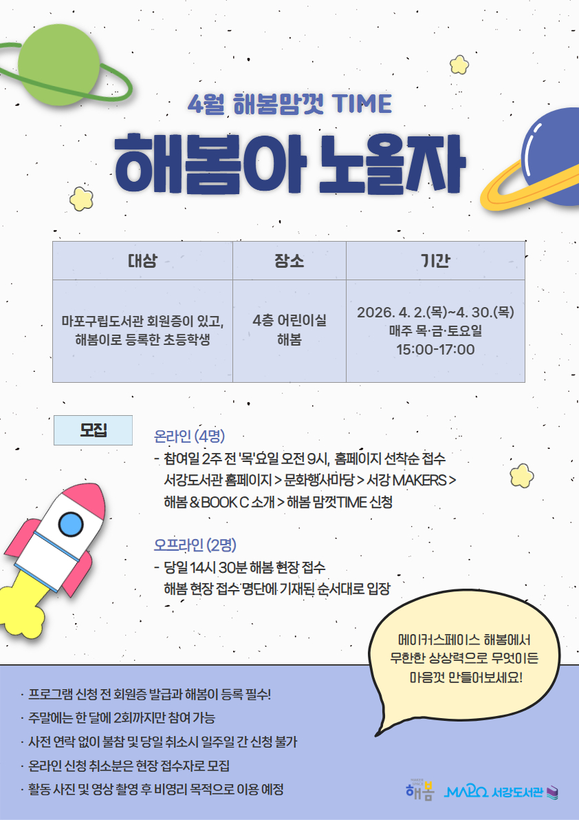 🟡 대상: 마포구립도서관 회원증이 있고 해봄이로 등록한 초등학생 🟡 기간 : 2026. 4. 2.(목)~4. 30(목), 매주 목·금·토요일 15:00~17:00 🟡 장소: 4층 어린이자료실 내 해봄 🟡 모집 ▷ 온라인(4명) - 참여일 2주 전 '목'요일 오전 9시, 홈페이지 선착순 접수 서강도서관 홈페이지> 문화행사마당 > 서강 Makers > 해봄 & Book C 소개 > 해봄 맘껏 Time 신청 ▷ 오프라인(2명) - 당일 14시 30분 해봄 현장 접수 - 해봄 현장 접수 명단에 기재된 순서대로 입장