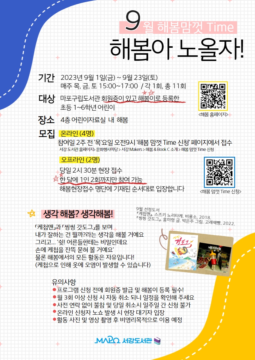🟡 대상: 마포구립도서관 회원증이 있고 해봄이로 등록한 초등 1~6학년 어린이