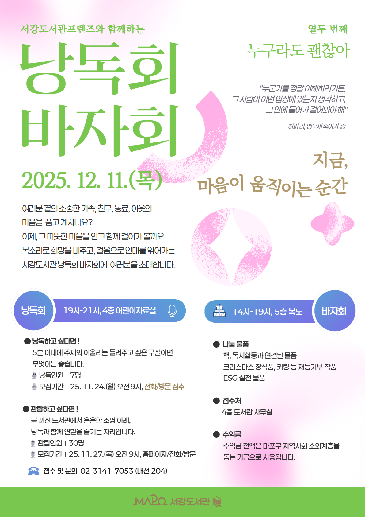 | 프로그램명 | [12월/낭독회] 누구라도 괜찮아 열두 번째 낭독회, 바자회 예정 | ||