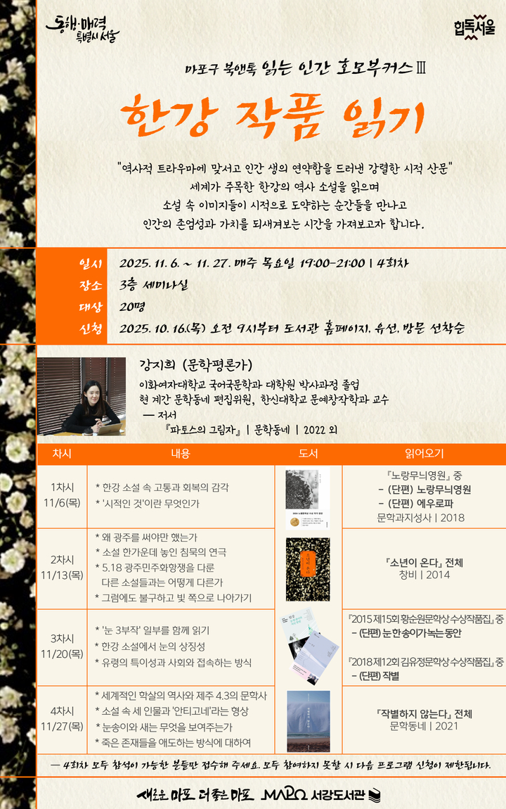 2025년 마포구립서강도서관 읽는 인간 호모 부커스 III. 한강 작품 읽기