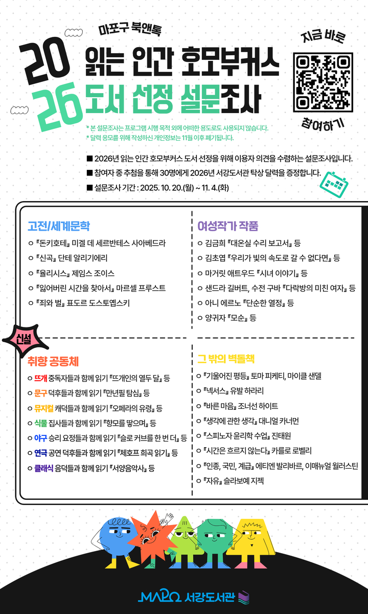2026년 마포구 북앤톡 읽는 인간 호모부커스 도서 선정 설문조사 * 본 설문조사는 프로그램 시행 목적 외에 어떠한 용도로도 사용되지 않습니다. * 달력 응모를 위해 작성하신 개인정보는 11월 이후 폐기됩니다. ■ 2026년 읽는 인간 호모부커스 도서 선정을 위해 이용자 의견을 수렴하는 설문조사입니다. ■ 참여자 중 추첨을 통해 30명에게 2026년 서강도서관 탁상 달력을 증정합니다. ■ 설문조사 기간 : 2025. 10. 20.(월) ~ 11. 4.(화)