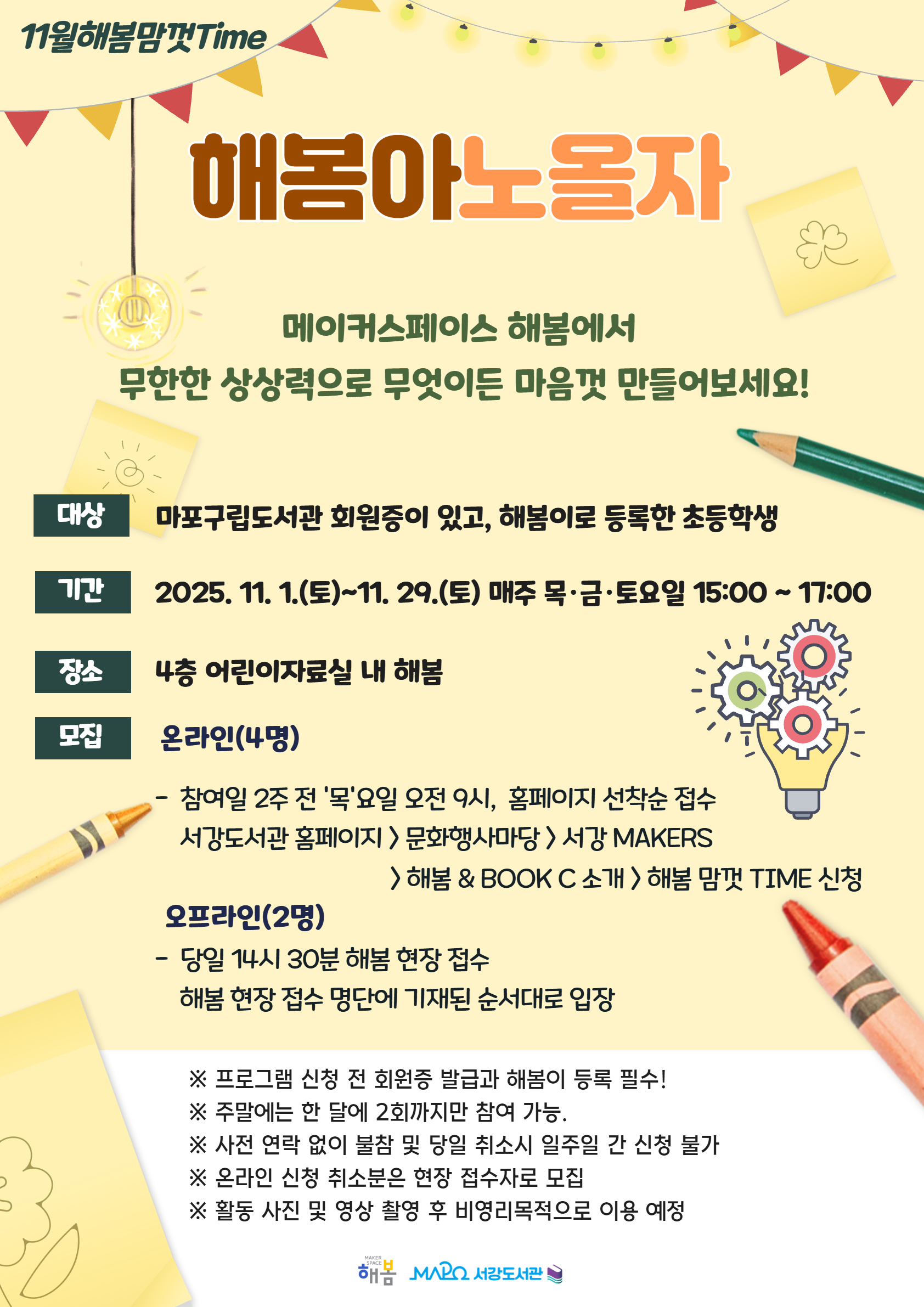 🟡 대상: 마포구립도서관 회원증이 있고 해봄이로 등록한 초등학생 🟡 기간 : 2025. 11. 1.(토)~11. 29.(토), 매주 목·금·토요일 15:00~17:00 🟡 장소: 4층 어린이자료실 내 해봄 🟡 모집 ▷ 온라인(4명) - 참여일 2주 전 '목'요일 오전 9시, 홈페이지 선착순 접수 서강도서관 홈페이지> 문화행사마당 > 서강 Makers > 해봄 & Book C 소개 > 해봄 맘껏 Time 신청 ▷ 오프라인(2명) - 당일 14시 30분 해봄 현장 접수 - 해봄 현장 접수 명단에 기재된 순서대로 입장
