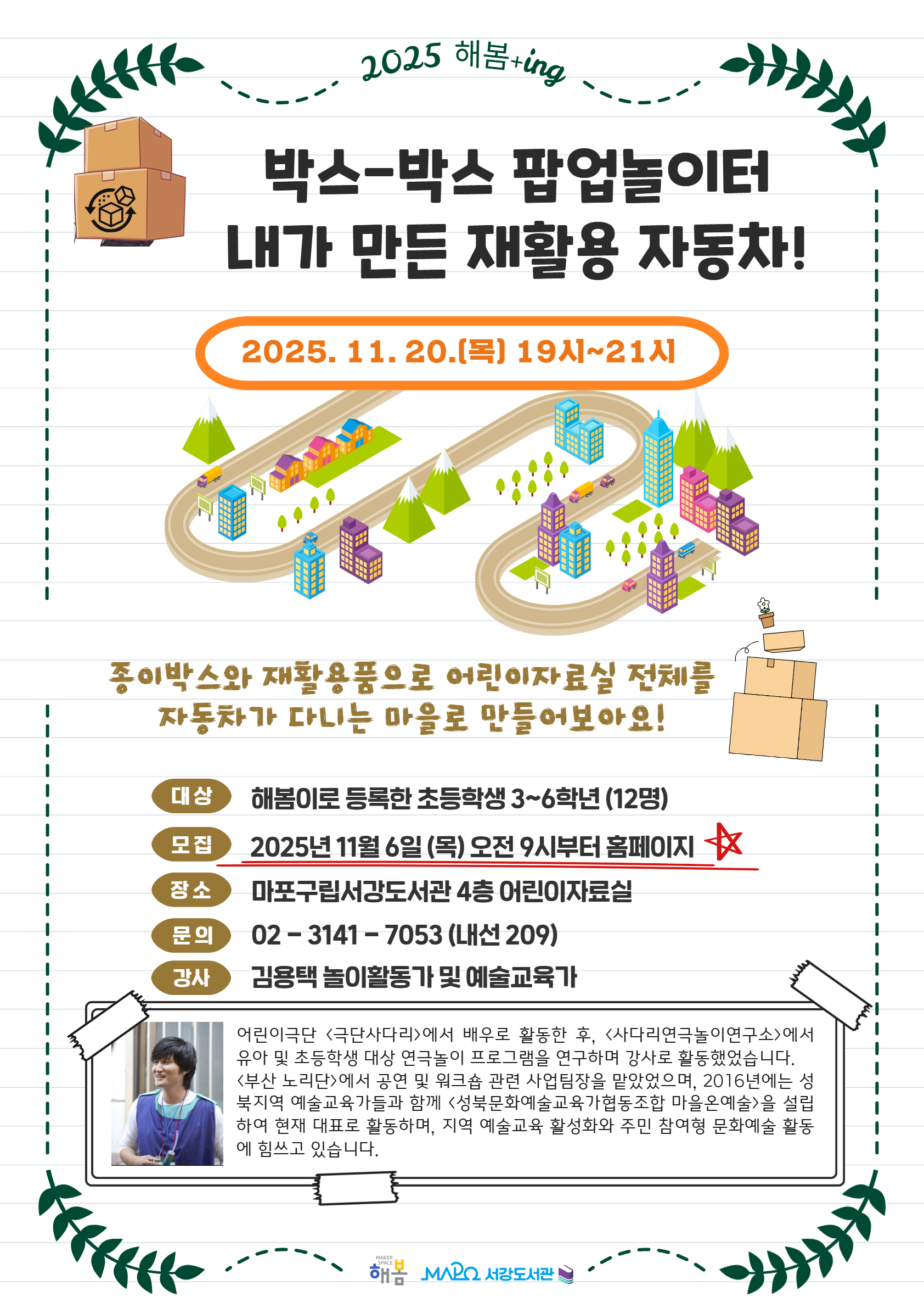 대상 | 해봄이로 등록한 초등학생 3~6학년 (12명) 모집 | 2025년 11월 6일(목) 오전 9시부터 홈페이지 장소 | 마포구립서강도서관 4층 어린이자료실 문의 | 02-3141-7053 (내선 209) 강사 | 김용택 놀이활동가 및 예술교육가